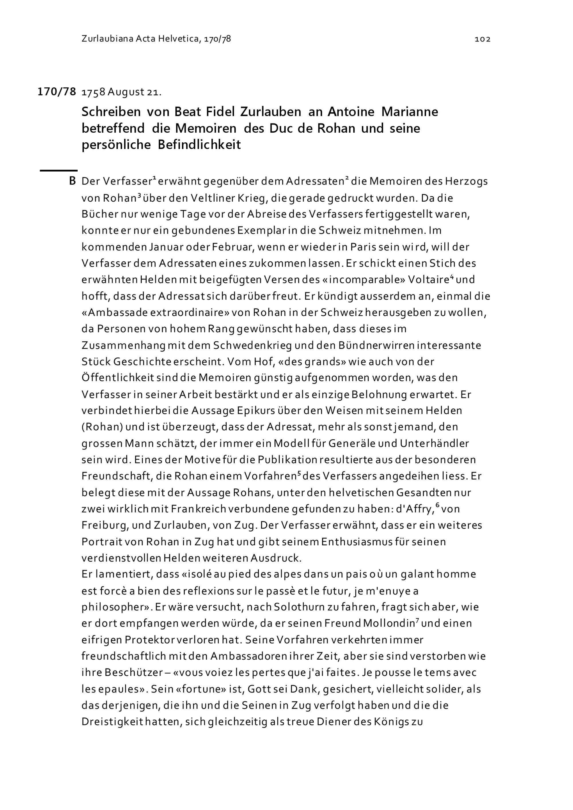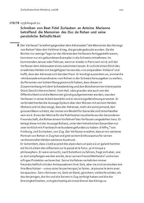 Schreiben von Beat Fidel Zurlauben an Antoine Marianne betreffend die Memoiren des Duc de Rohan und seine persönliche Befindlichkeit