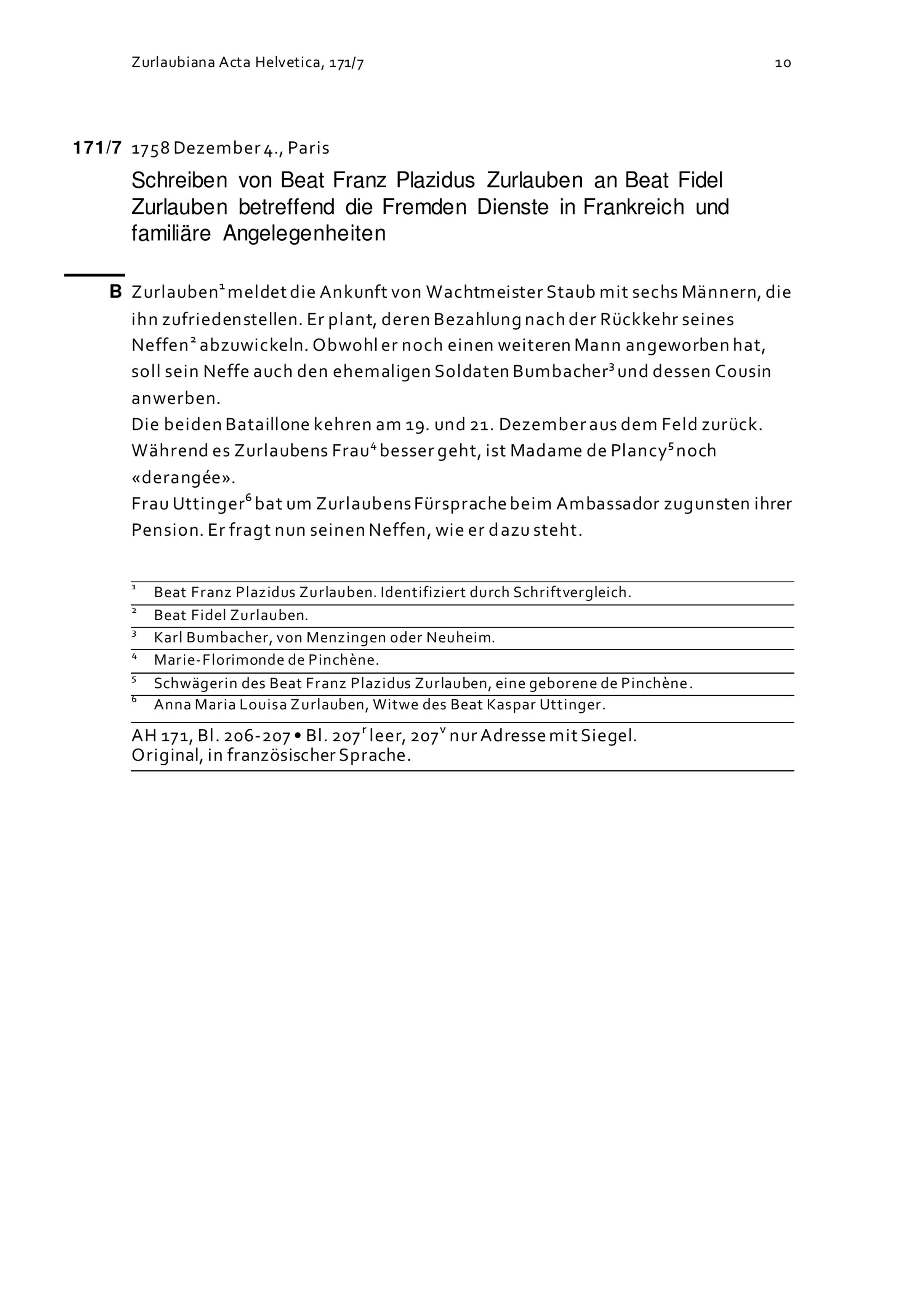 Schreiben von Beat Franz Plazidus Zurlauben an Beat Fidel Zurlauben betreffend die Fremden Dienste in Frankreich und familiäre Angelegenheiten
