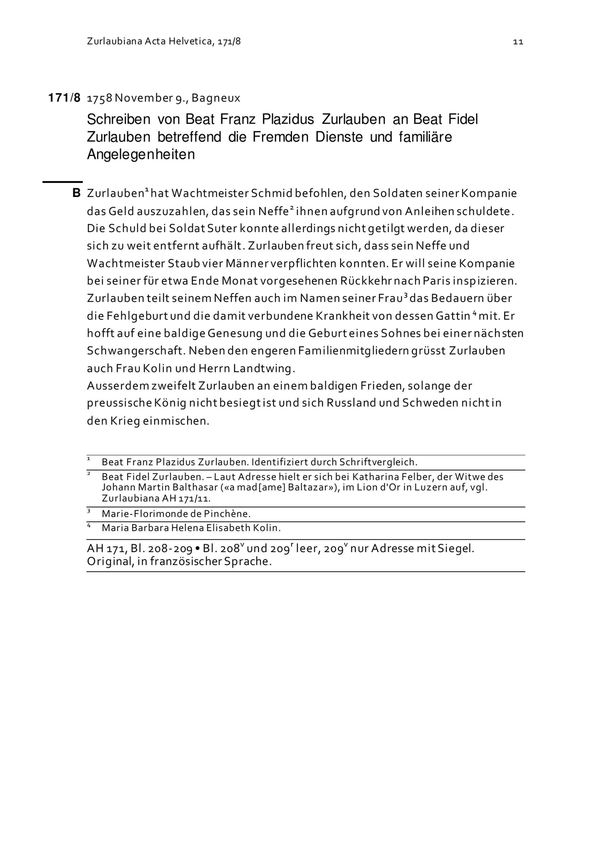 Schreiben von Beat Franz Plazidus Zurlauben an Beat Fidel Zurlauben betreffend die Fremden Dienste in Frankreich und familiäre Angelegenheiten