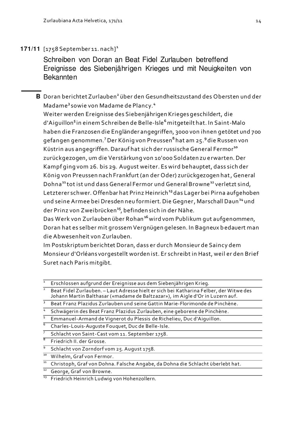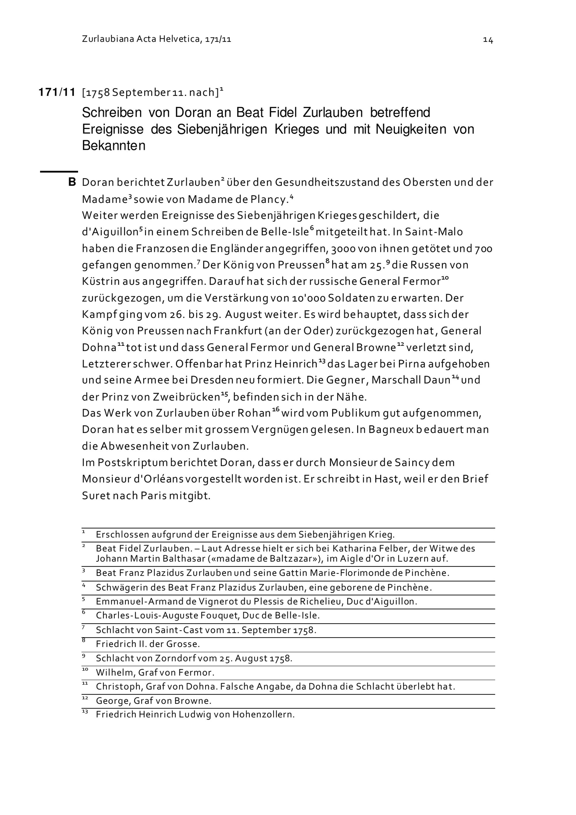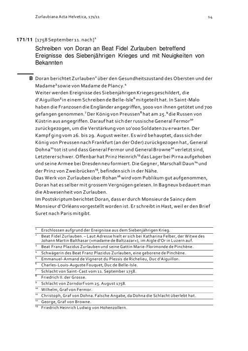 Schreiben von Doran Beat Fidel Zurlauben betreffend Ereignisse des Siebenjährigen...