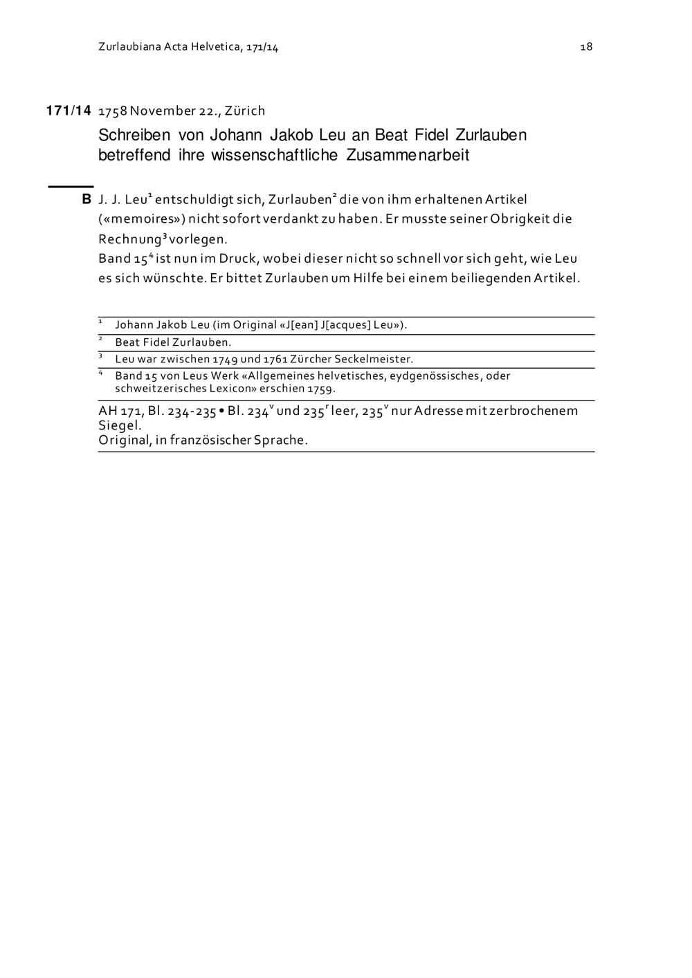 Schreiben von Johann Jakob Leu an Beat Fidel Zurlauben betreffend ihre wissenschaftliche...