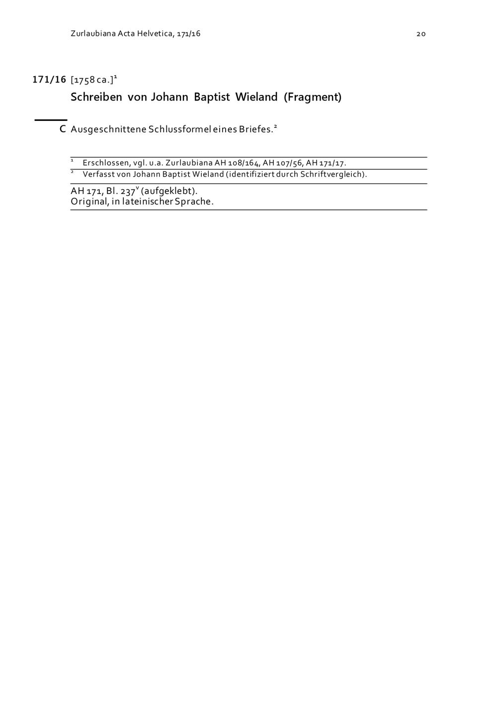 Schreiben von Johann Baptist Wieland an Beat Fidel Zurlauben betreffend die Beschaffung von Literatur