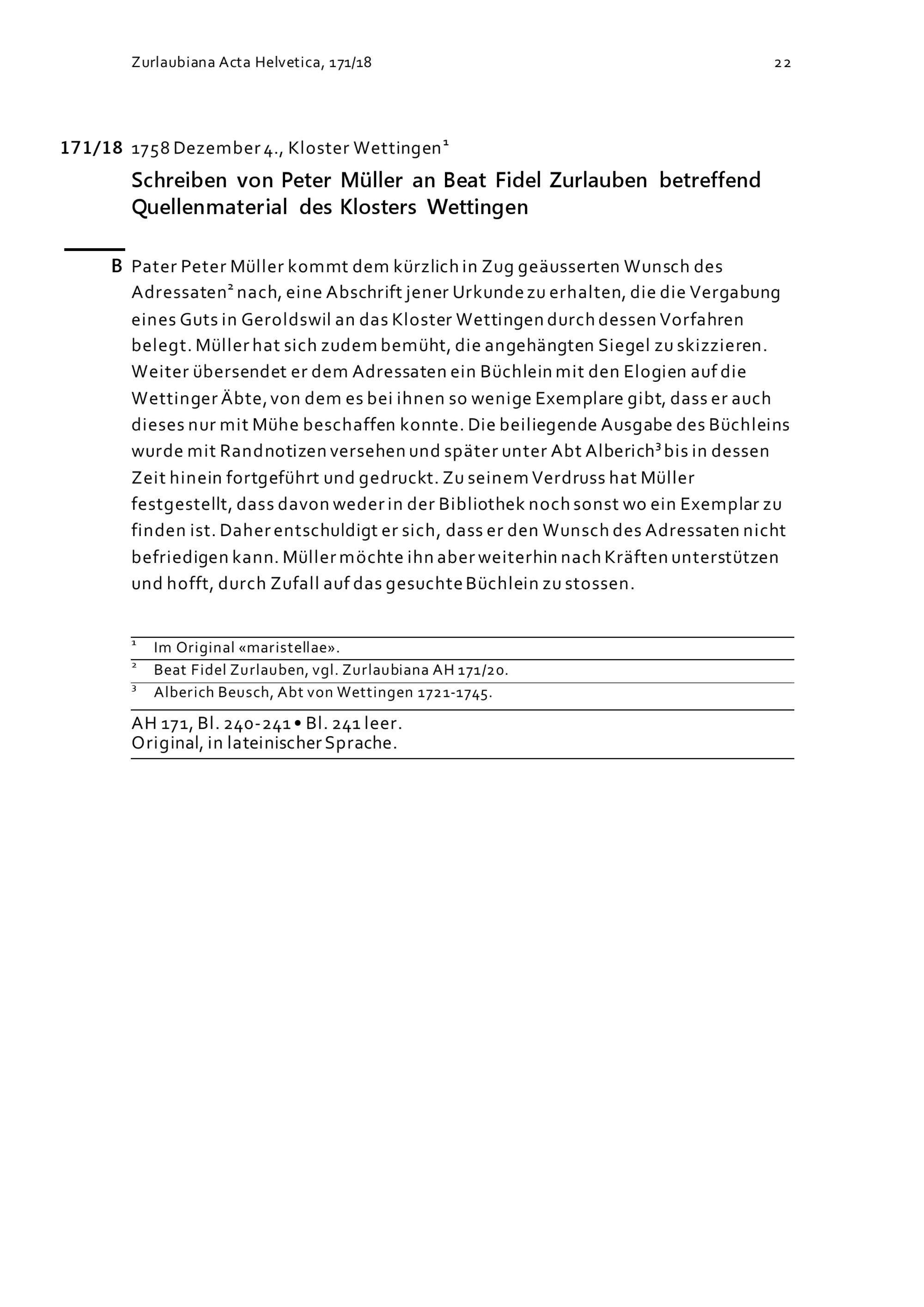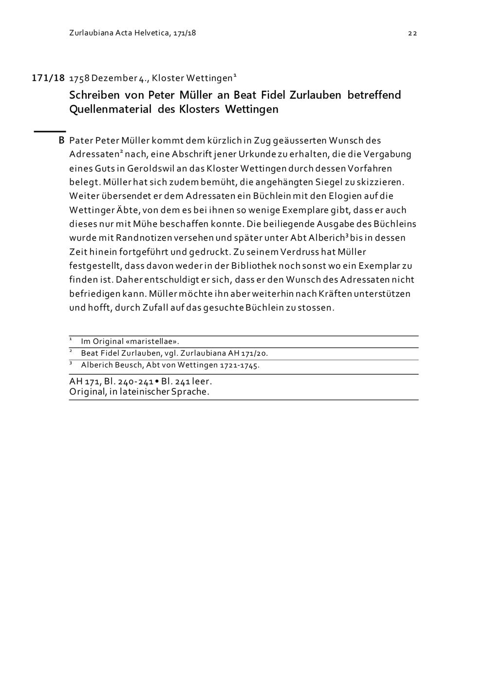 Schreiben von Peter Müller an Beat Fidel Zurlauben betreffend Quellenmaterial des Klosters Wettingen