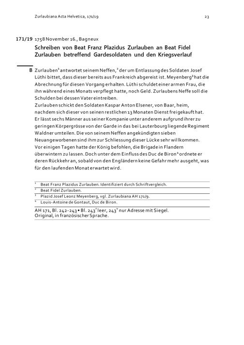 Schreiben von Beat Franz Plazidus Zurlauben an Beat Fidel Zurlauben betreffend Gardesoldaten...