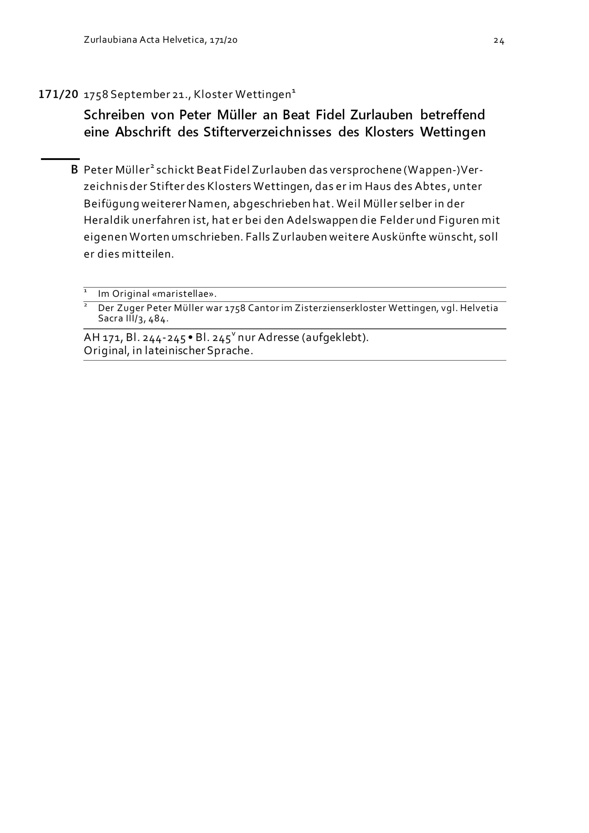 Schreiben von Peter Müller an Beat Fidel Zurlauben betreffend Quellenmaterial des Klosters Wettingen