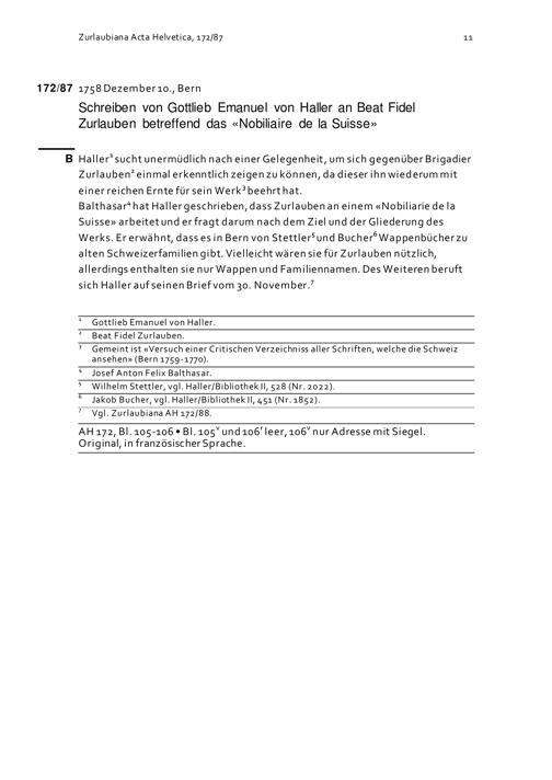 Schreiben von Gottlieb Emanuel von Haller an Beat Fidel Zurlauben betreffend das...
