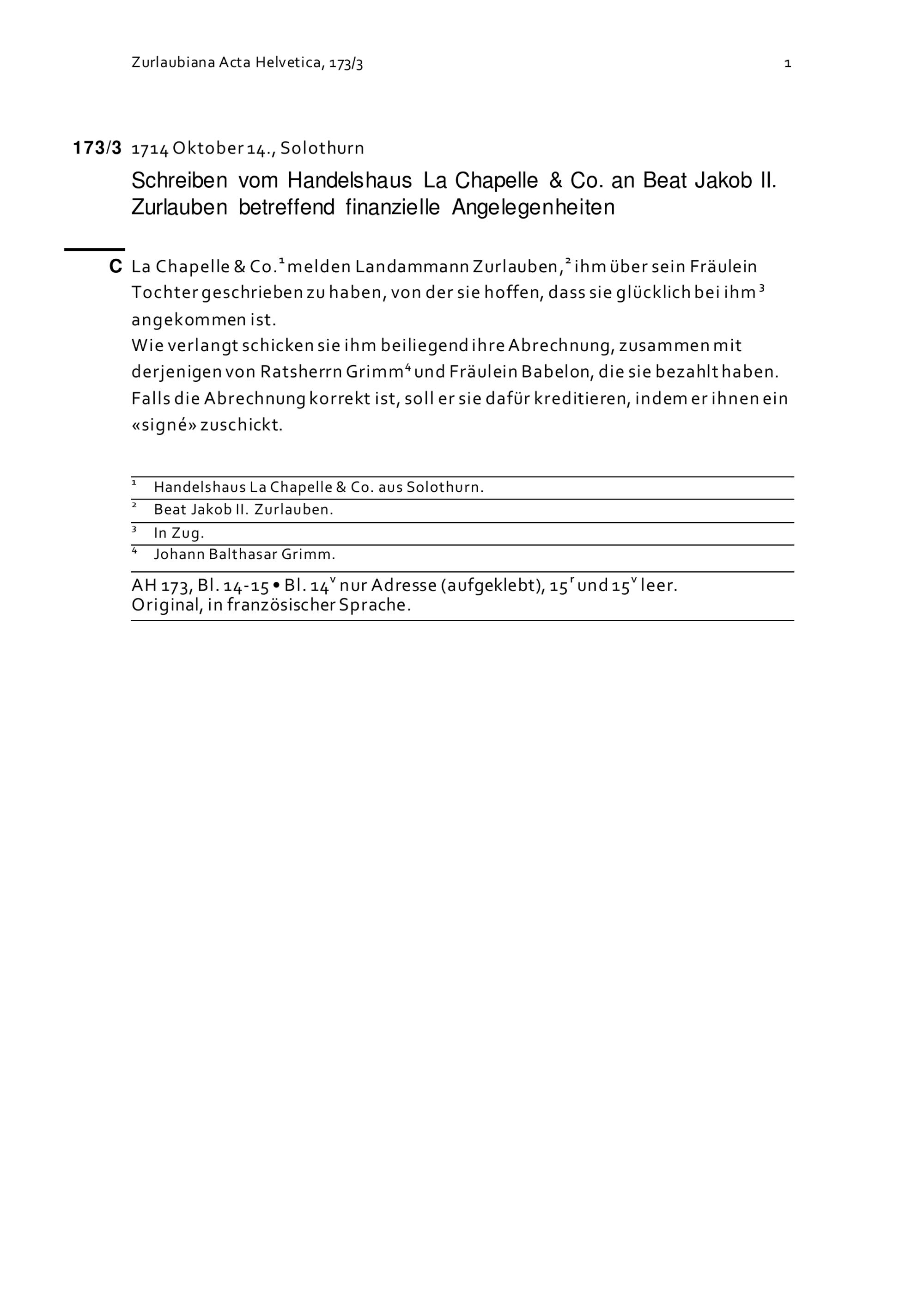 Schreiben des Handelshaus La Chapelle & Co. an Beat Jakob II. Zurlauben betreffend finanzielle Angelegenheiten