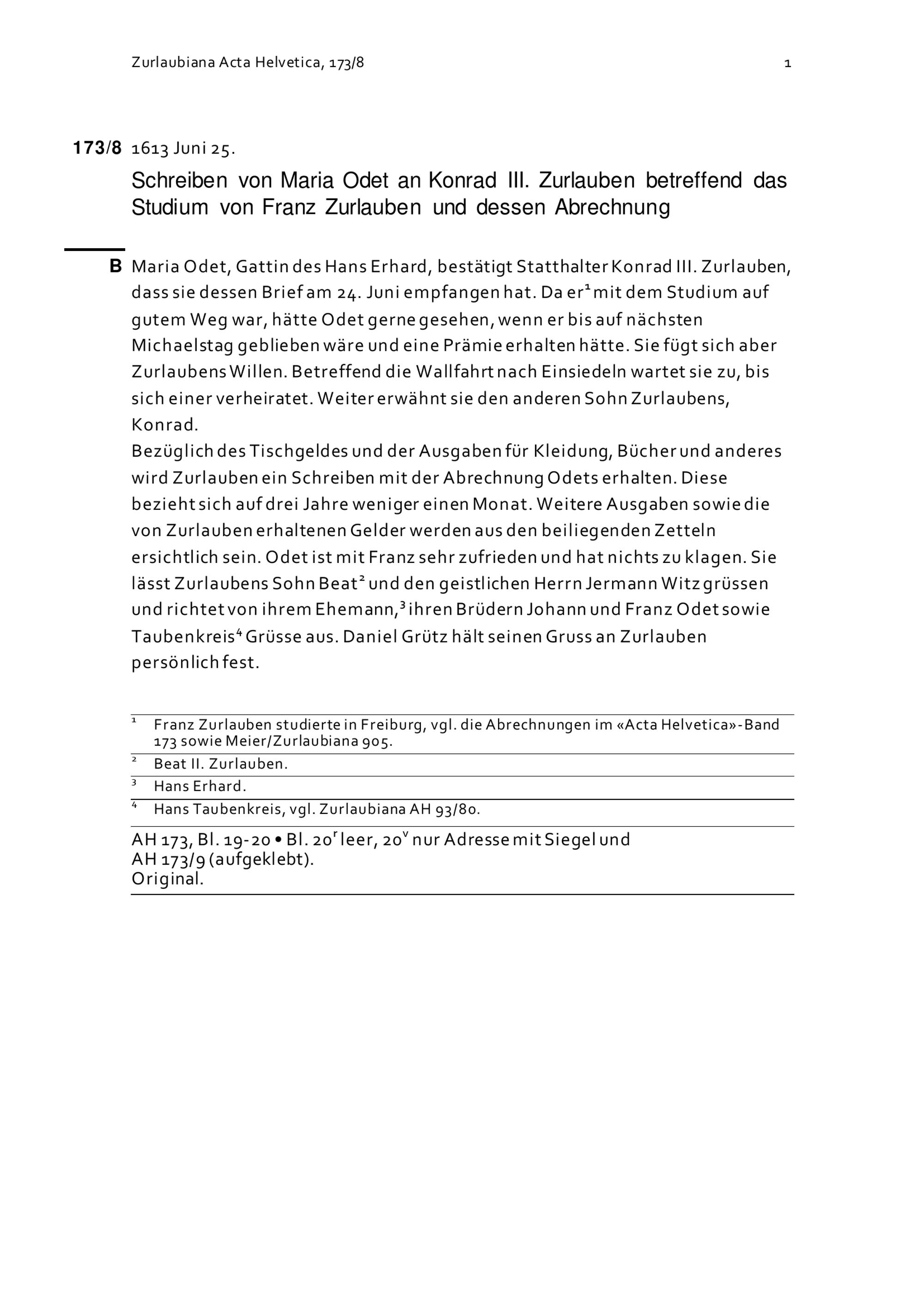 Schreiben von Maria Odet an Konrad III. Zurlauben betreffend das Studium von Franz...