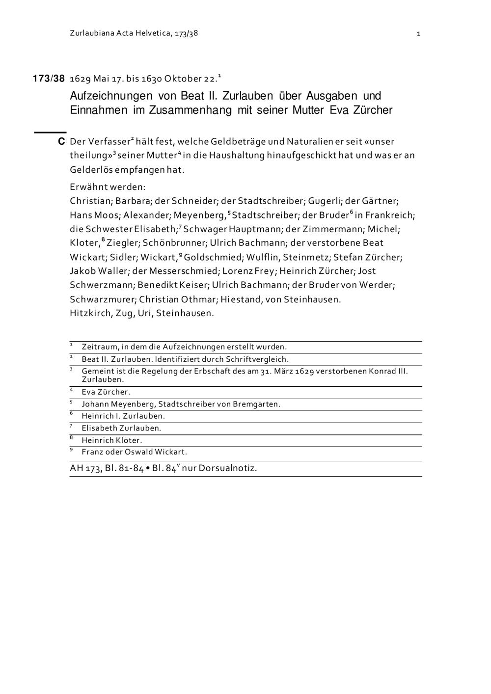 Aufzeichnungen von Beat II. Zurlauben über Ausgaben und Einnahmen in Zusammenhang mit Eva Zürcher, seiner Mutter