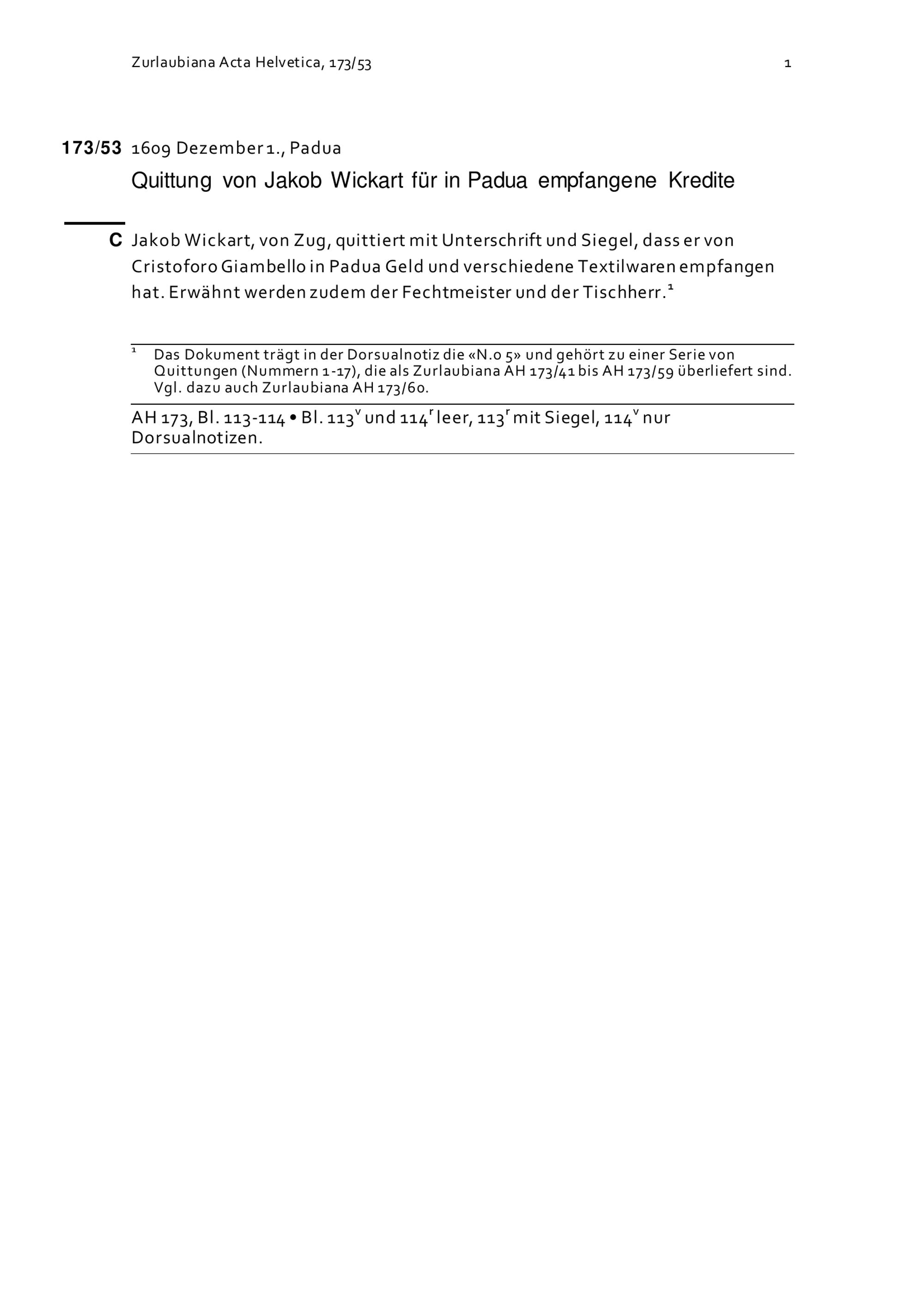 Quittung von Jakob Wickart für in Padua empfangene Kredite