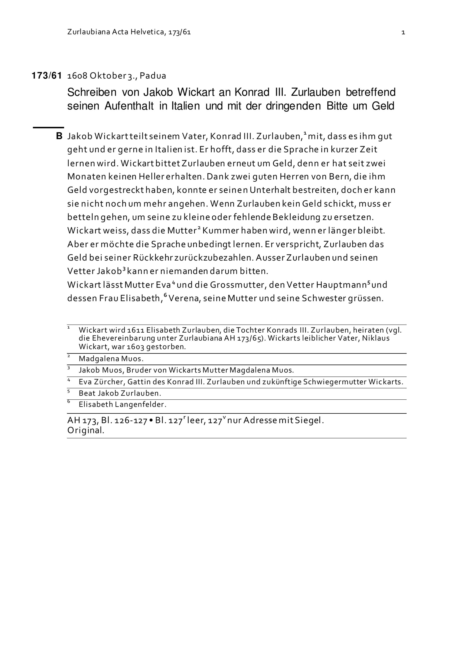 Schreiben von Jakob Wickart an Konrad III. Zurlauben betreffend seinen Aufenthalt in Italien und der dringenden Bitte um Geld