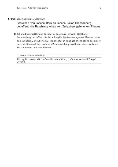 Schreiben von Johann Born an Johann Jakob Brandenberg betreffend die Bezahlung eines von Zurlauben geliehenen Pferdes