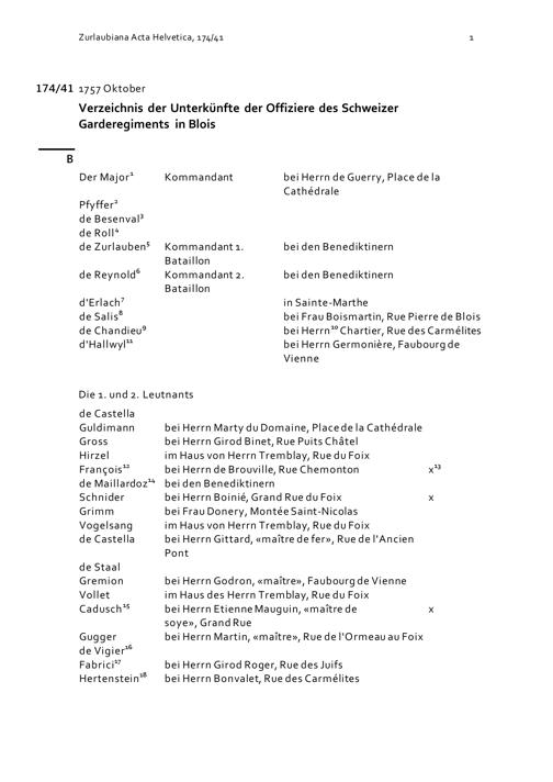 Verzeichnis der Unterkünfte der Offiziere des Schweizer Garderegiments in Blois