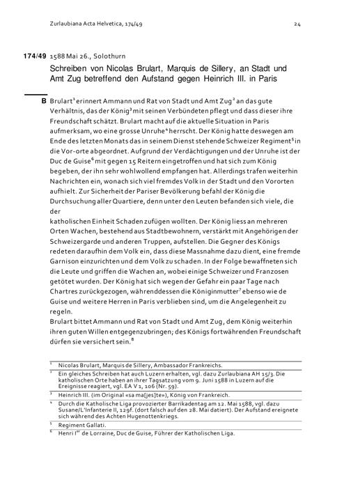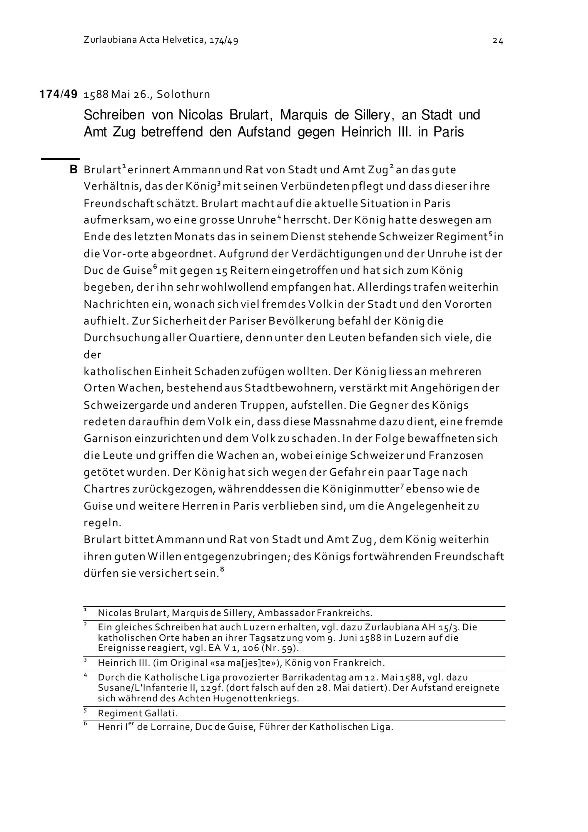 Schreiben von Nicolas Brûlart, Marquis de Sillery, an Stadt und Amt Zug betreffend den Aufstand gegen Heinrich III. in Paris