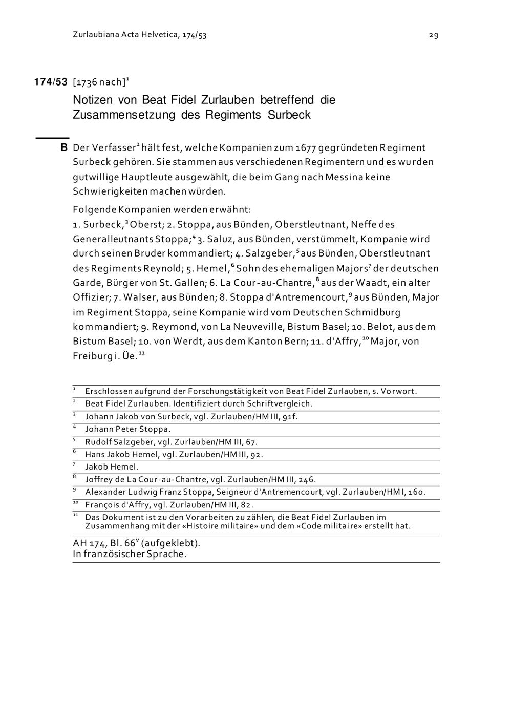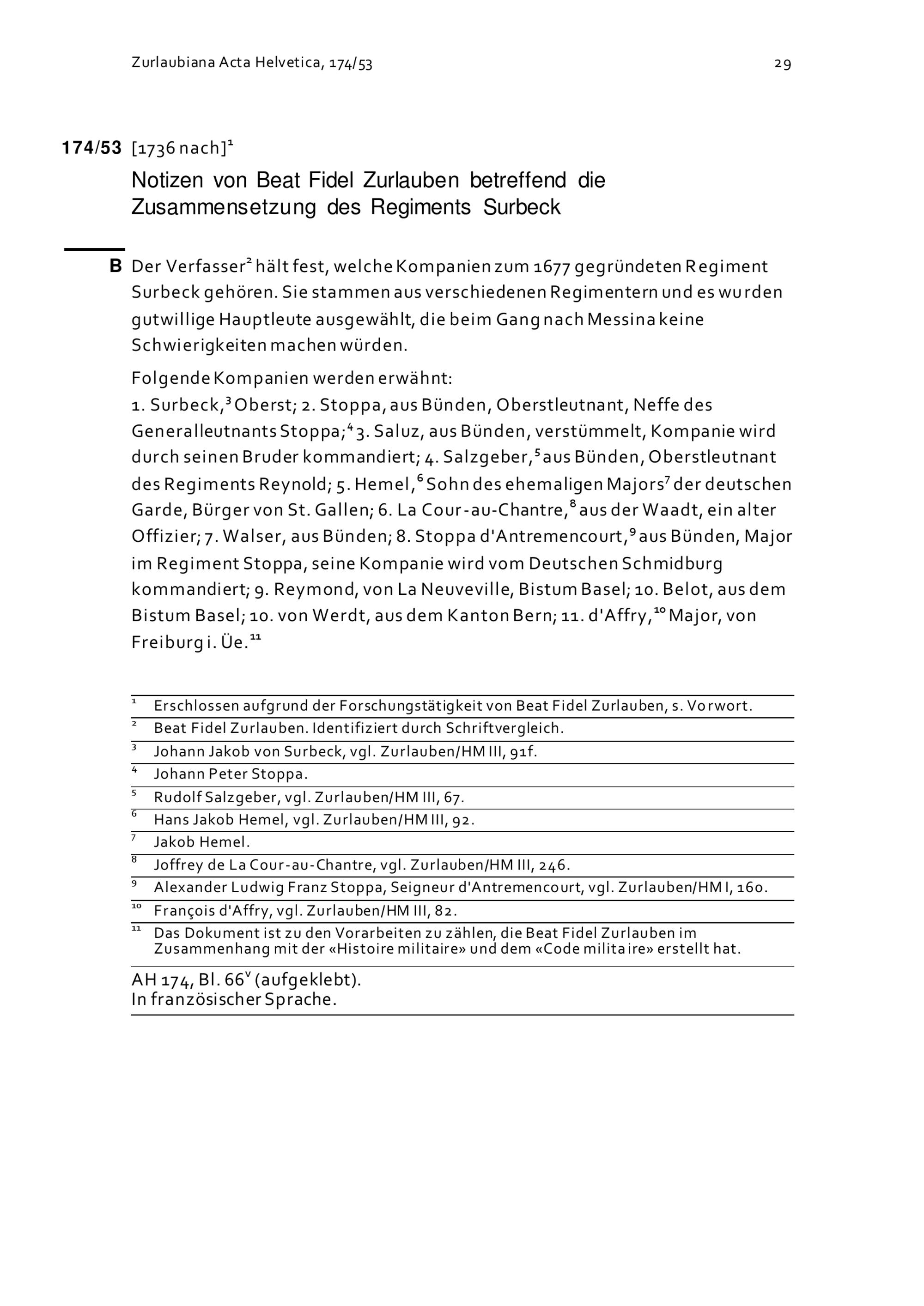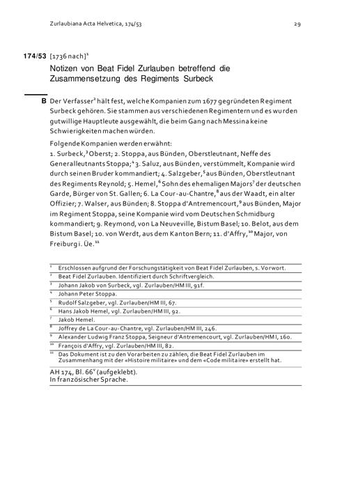 Notiz von Beat Fidel Zurlauben betreffend die Zusammensetzung des Regiments Surb...