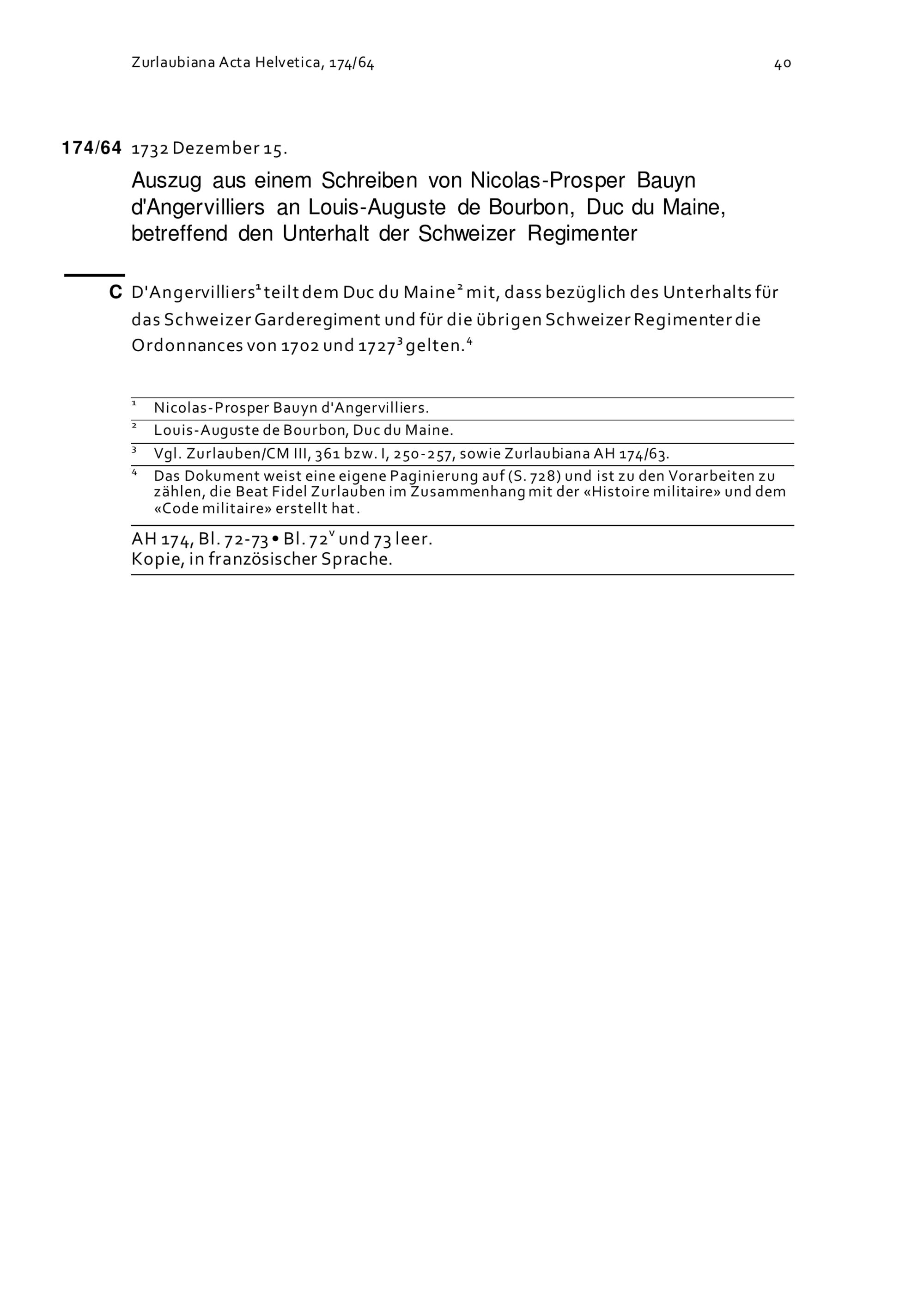 Schreiben von Nicolas-Prosper Bauyn d'Angervilliers an Louis-Auguste de Bourbon, Duc du Maine, betreffend den Unterhalt der Schweizer Regimenter