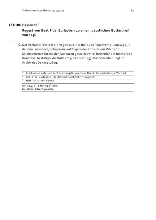 Regest von Beat Fidel Zurlauben zu einem päpstlichen Butterbrief von 1456