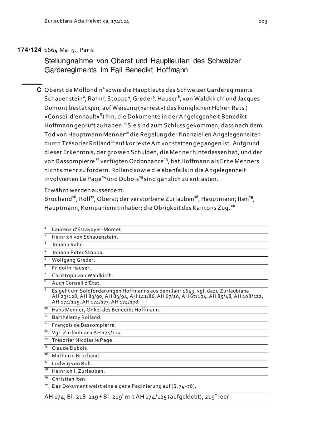 Stellungnahme von Oberst und Hauptleuten des Schweizer Garderegiments im Fall Benedikt Hoffmann