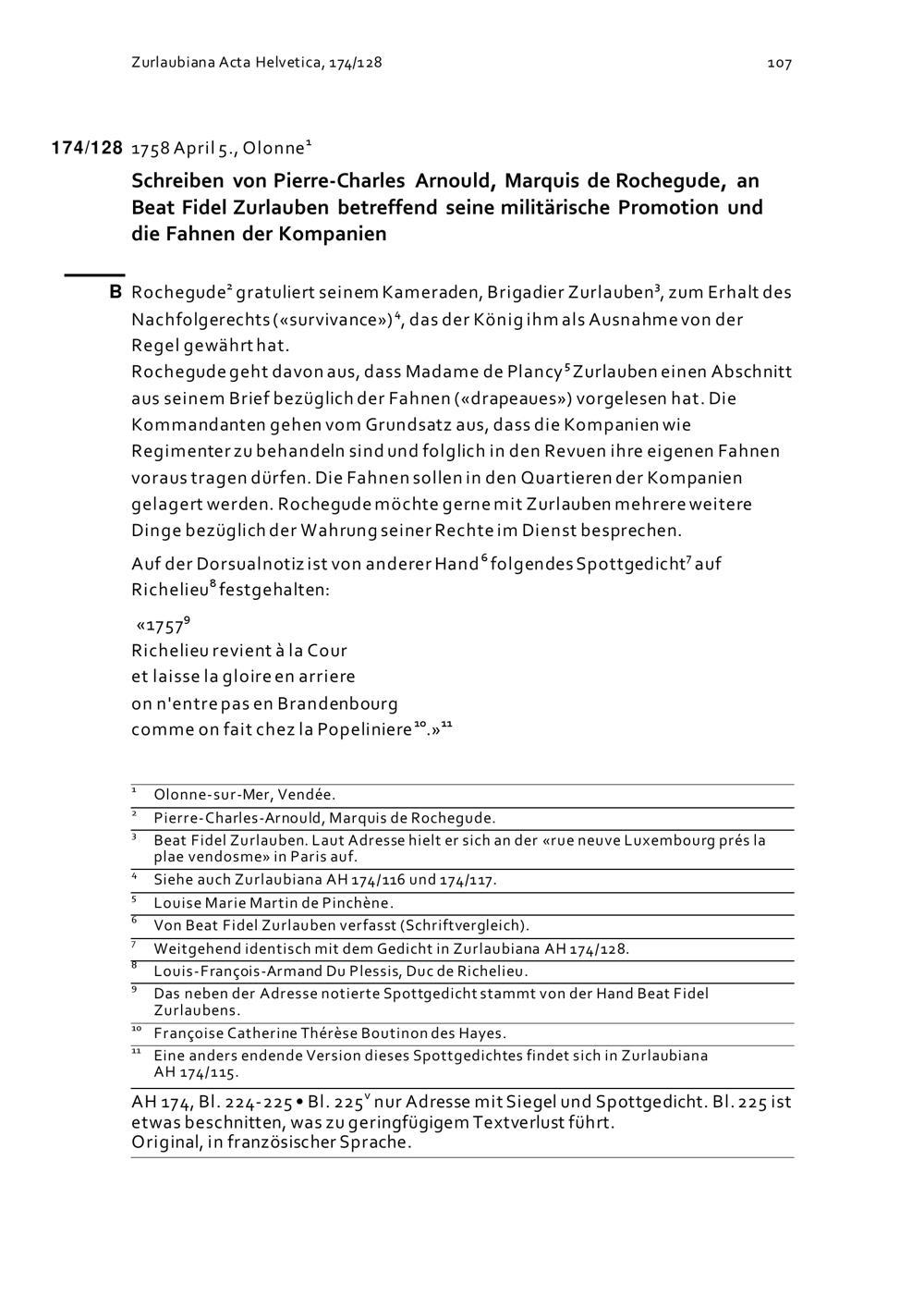 Schreiben von Pierre-Charles Arnould, Marquis de Rochegude, an Beat Fidel Zurlauben betreffend seine militärische Promotion und die Fahnen der Kompanien