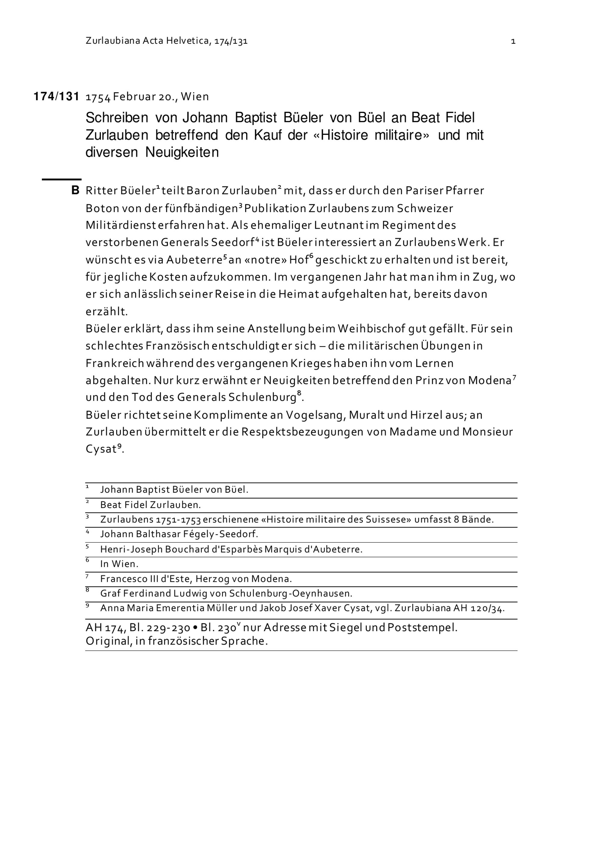 Schreiben von Johann Baptist Büeler von Büel an Beat Fidel Zurlauben betreffend den Kauf der «Histoire militaire» und mit diversen Neuigkeiten