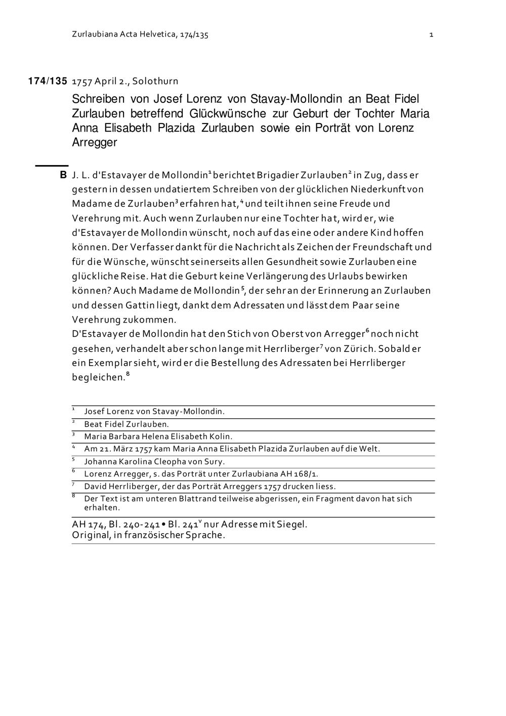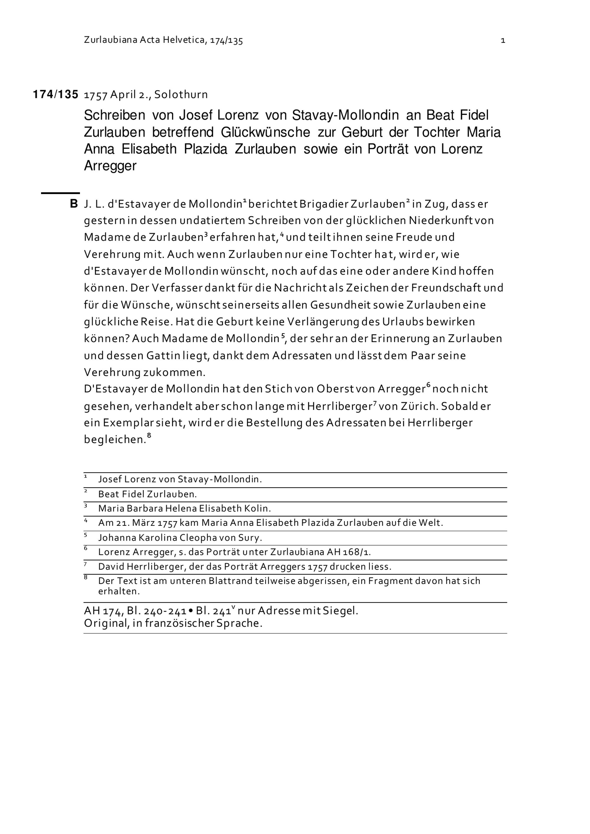 Schreiben von Josef Lorenz von Stavay-Mollondin an Beat Fidel Zurlauben betreffend Glückwünsche zur Geburt der Tochter Maria Anna Elisabeth Plazida Zurlauben sowie ein Porträt von Lorenz Aregger