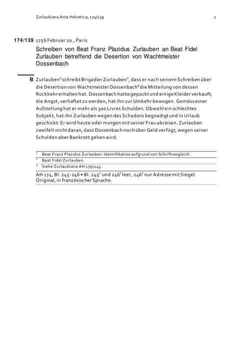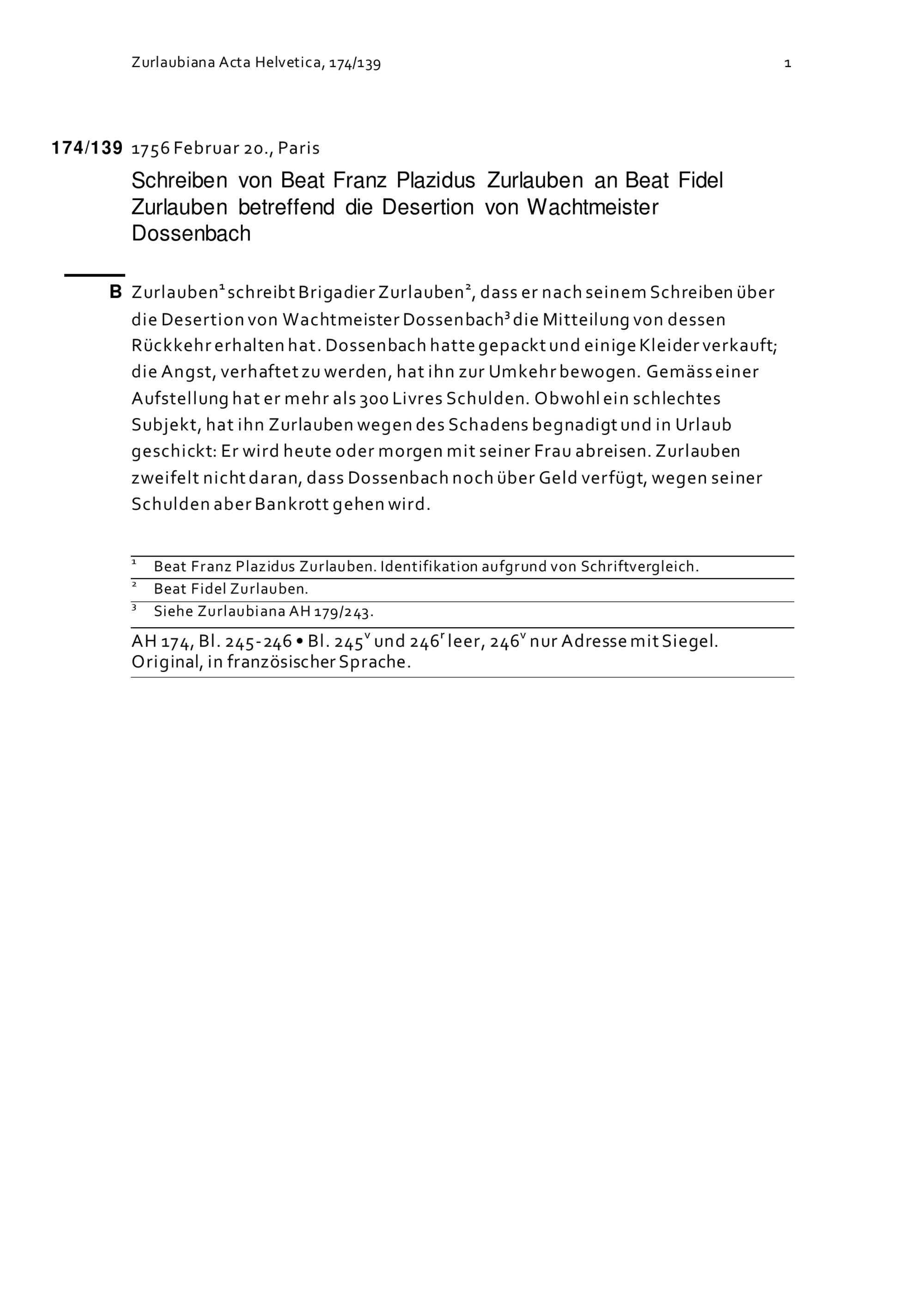 Schreiben von Beat Franz Plazidus Zurlauben an Beat Fidel Zurlauben betreffend die Desertion von Wachtmeister Dossenbach