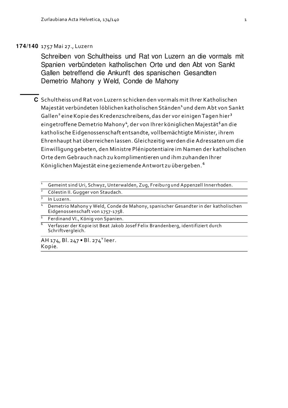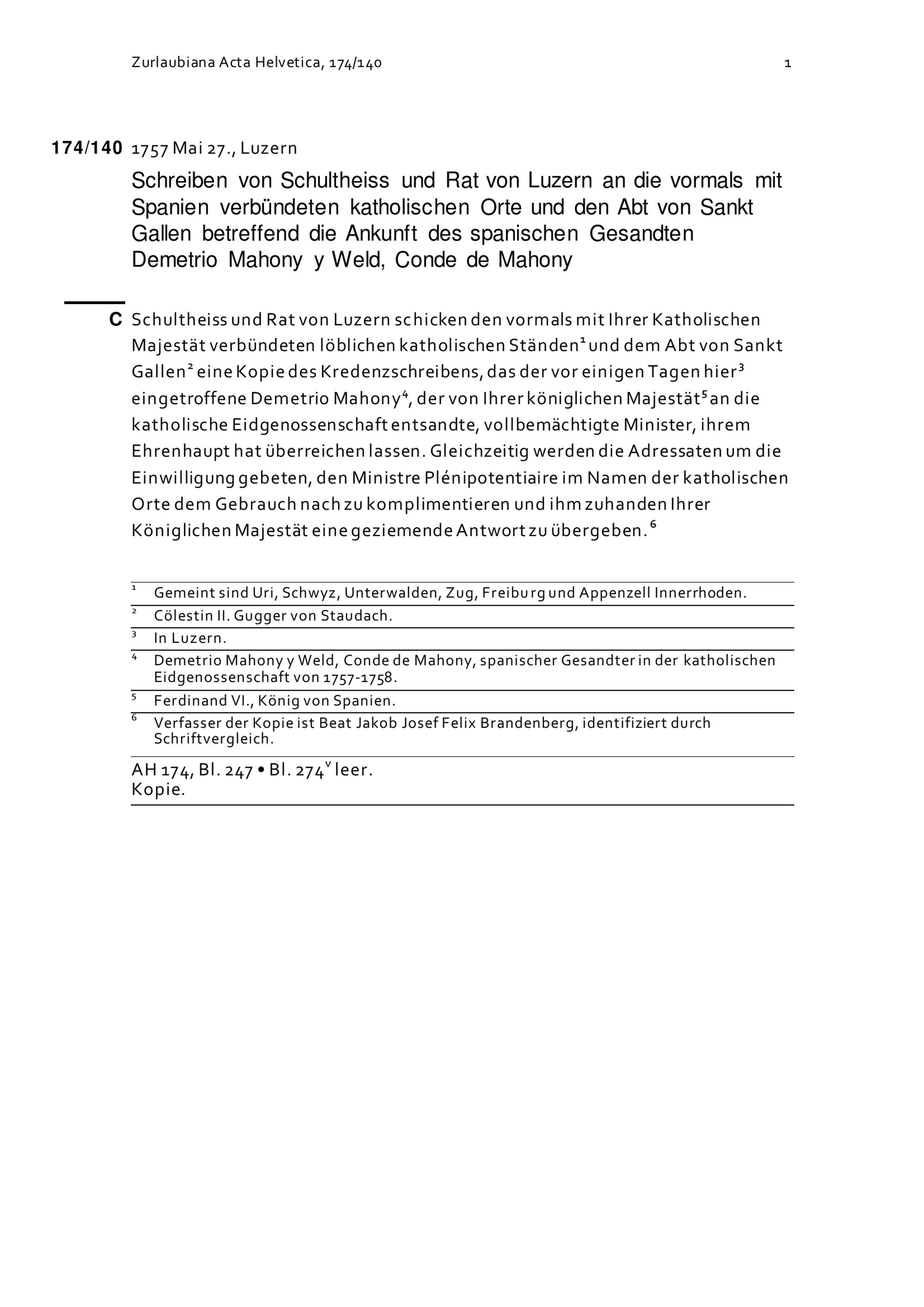 Schreiben des Schultheiss und Rats Luzern an die vormals mit Spanien verbündeten Katholischen Orte und an den Abt von Sankt Gallen betreffend die Ankunft von Demetrio Mahony y Weld, Conde de Mahony, Gesandter von Spanien