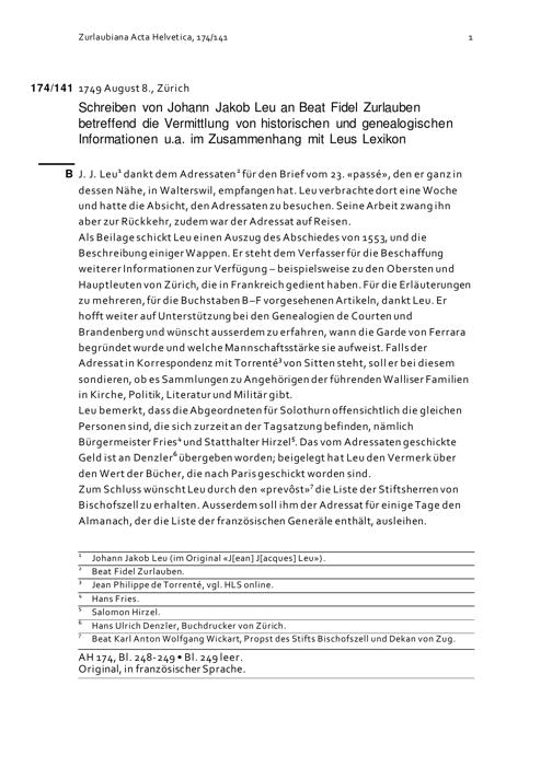 Schreiben von Johann Jakob Leu an Beat Fidel Zurlauben betreffend die Vermittlung von historischen und genealogischen Informationen u.a. in Zusammenhang mit dem Lexikon von Leu
