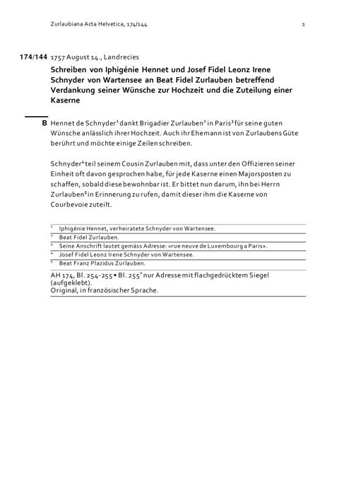 Schreiben von Iphigénie Hennet und Josef Fidel Leonz Irene Schnyder von Wartensee an Beat Fidel Zurlauben betreffend Verdankung dessen Wünsche zur Hochzeit und die Zuteilung einer Kaserne