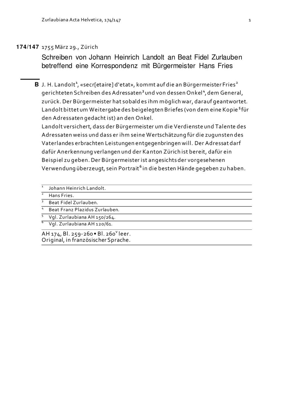 Schreiben von Johann Heinrich Landolt an Beat Fidel Zurlauben betreffend eine Korrespondenz...