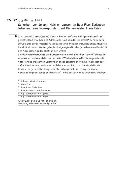 Schreiben von Johann Heinrich Landolt an Beat Fidel Zurlauben betreffend eine Korrespondenz mit Bürgermeister Hans Fries