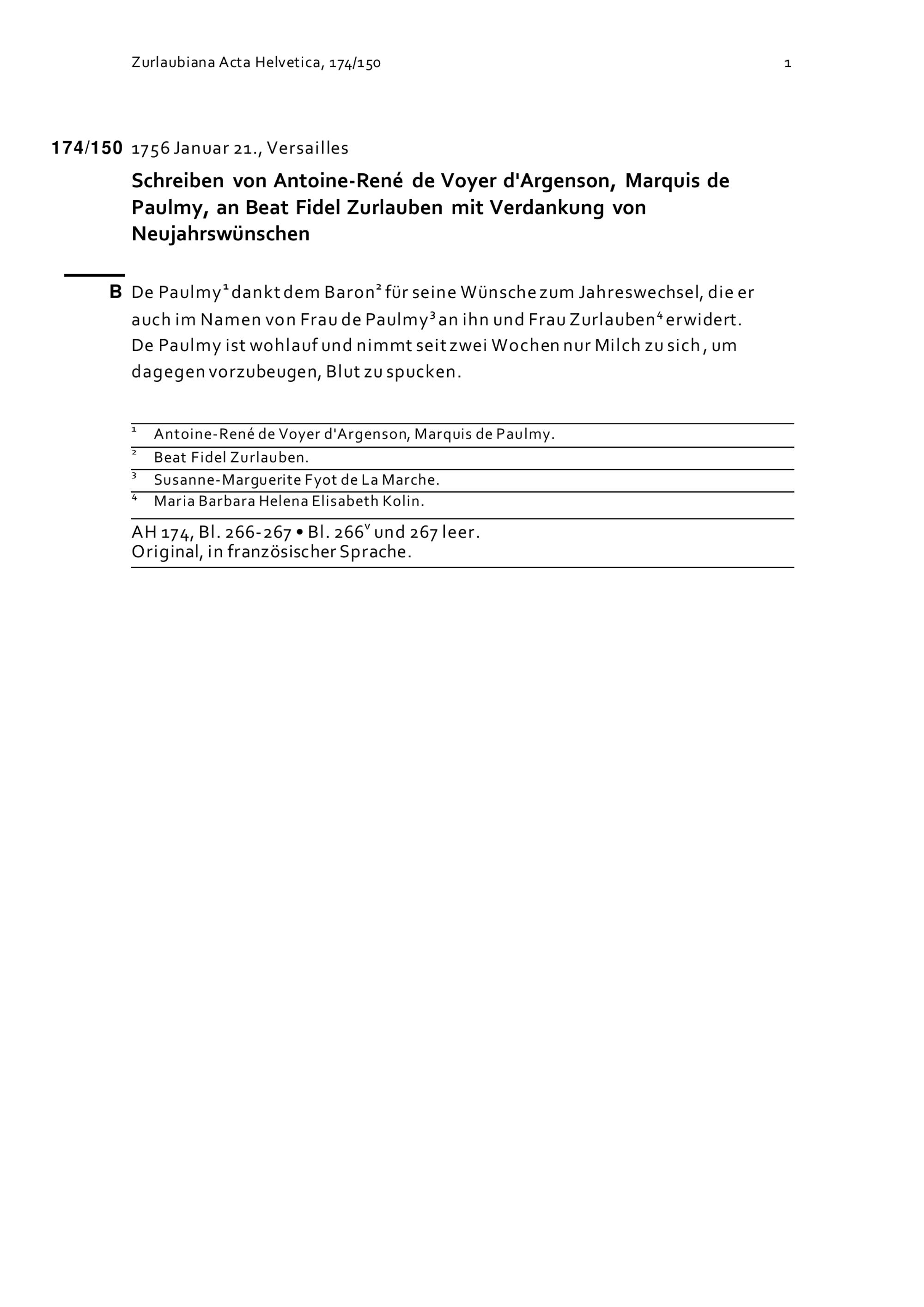 Schreiben von Antoine-René de Voyer d'Argenson, Marquis de Paulmy, an Beat Fidel...