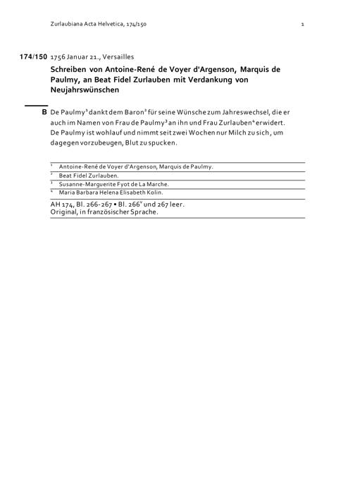 Schreiben von Antoine-René de Voyer d'Argenson, Marquis de Paulmy, an Beat Fidel Zurlauben mit Verdankung von Neujahrswünschen