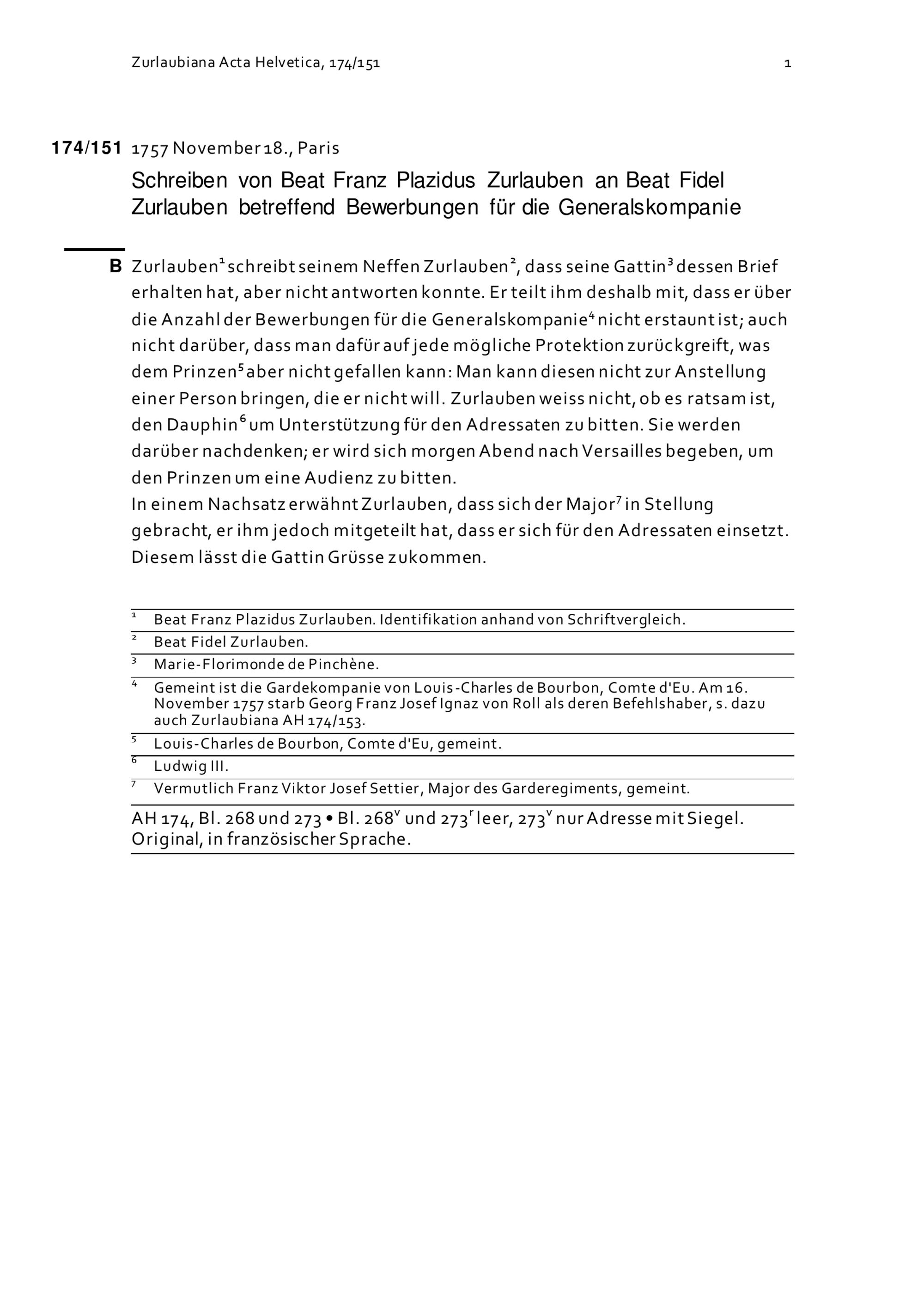 Schreiben von Beat Franz Plazidus Zurlauben an Beat Fidel Zurlauben betreffend Bewerbungen für die Generalskompanie