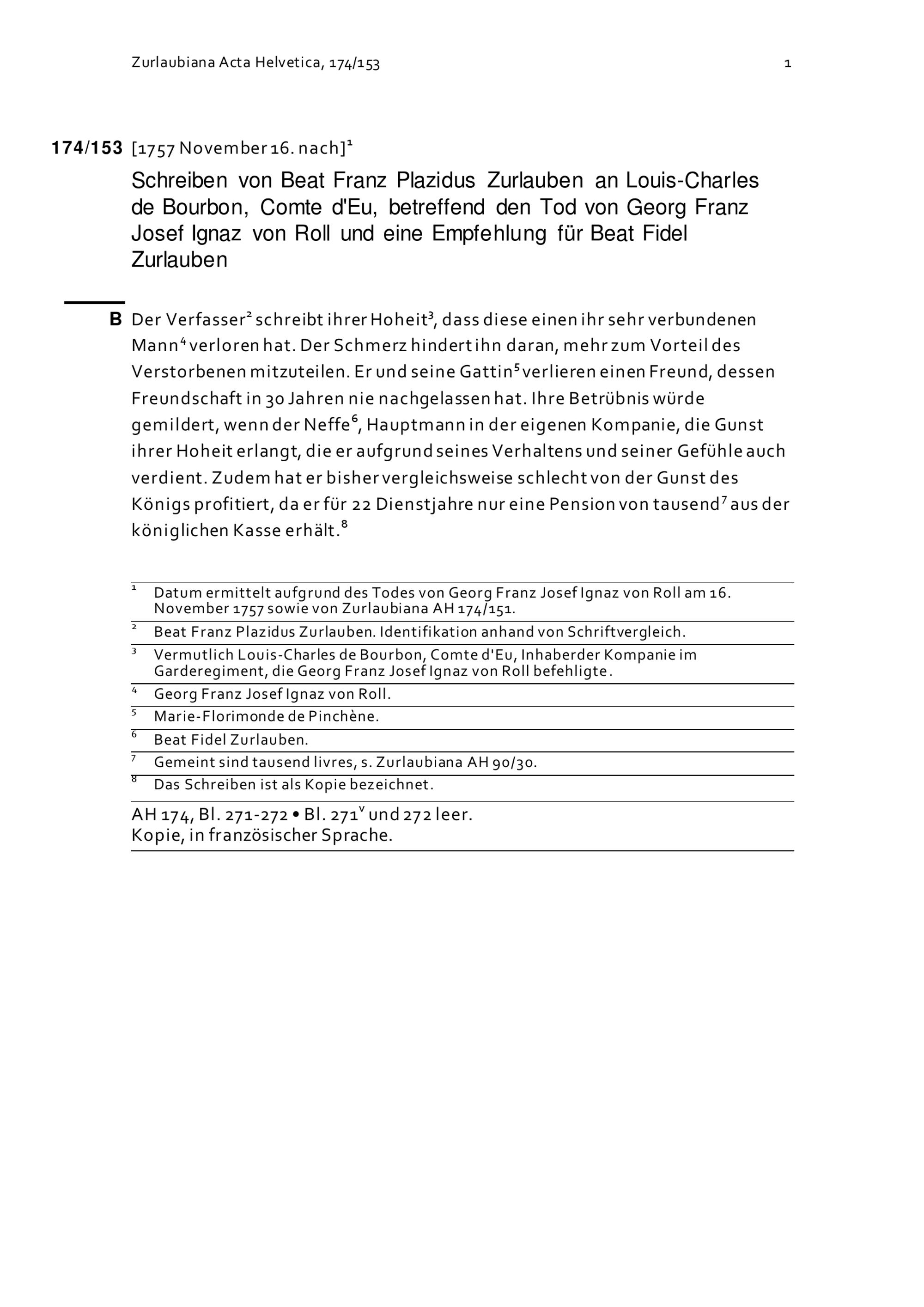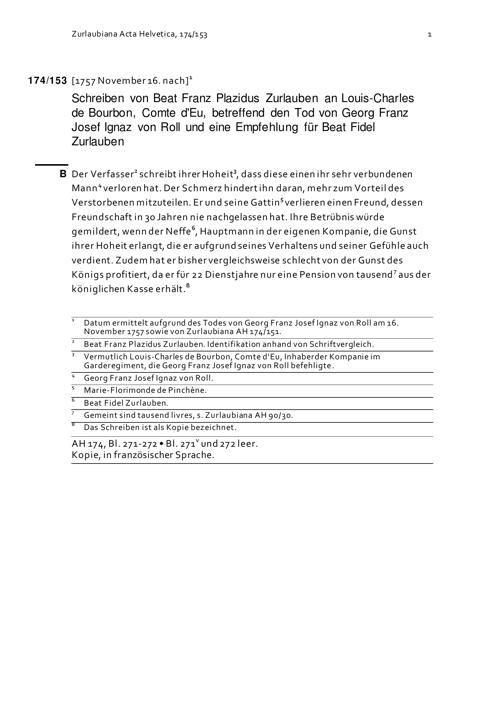 Schreiben von Beat Franz Plazidus Zurlauben an Louis-Charles de Bourbon, Comte d'Eu, betreffend den Tod von Georg Franz Josef Ignaz von Roll und eine Empfehlung für Beat Fidel Zurlauben
