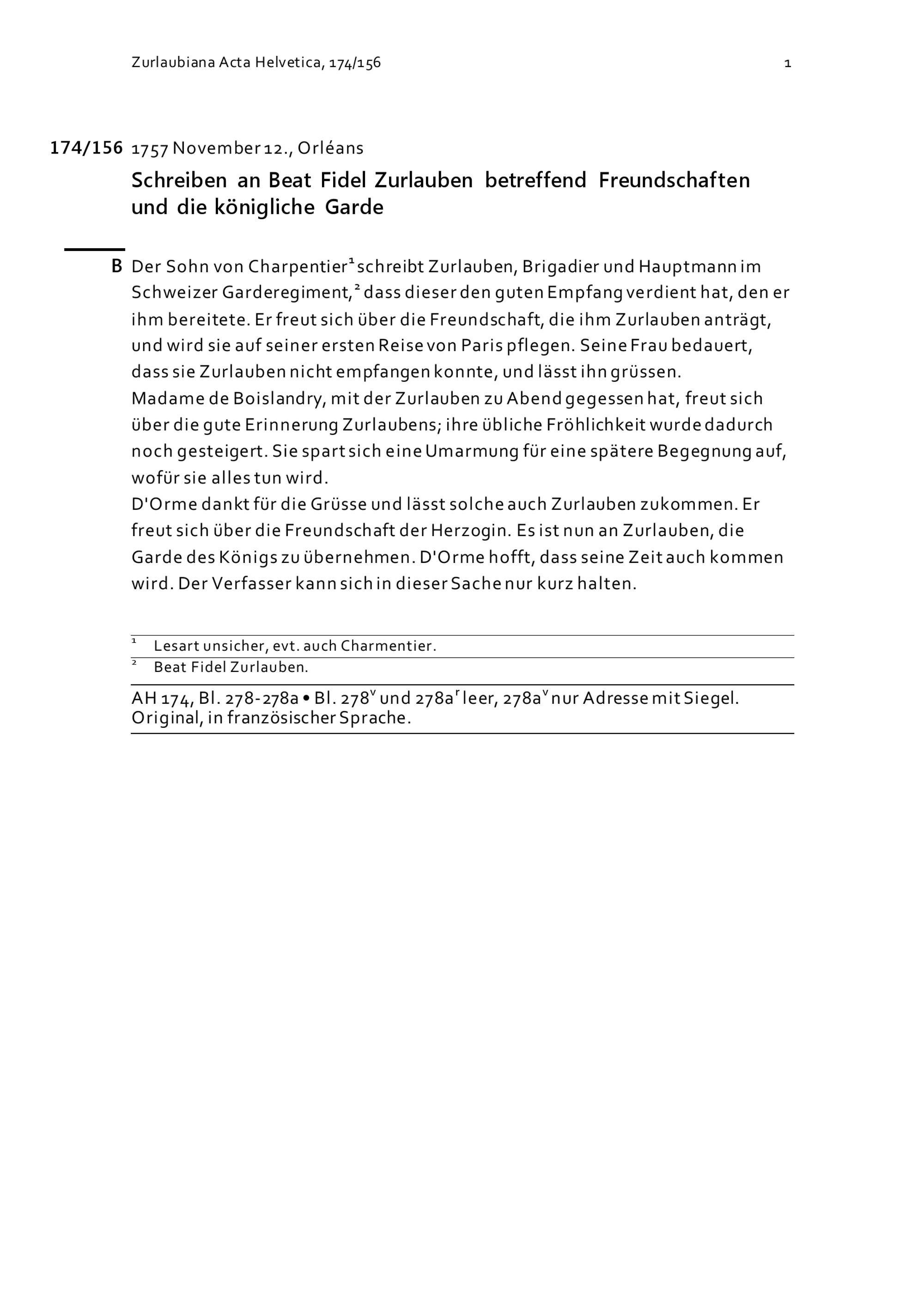Schreiben an Beat Fidel Zurlauben betreffend Freundschaften und die königliche Garde