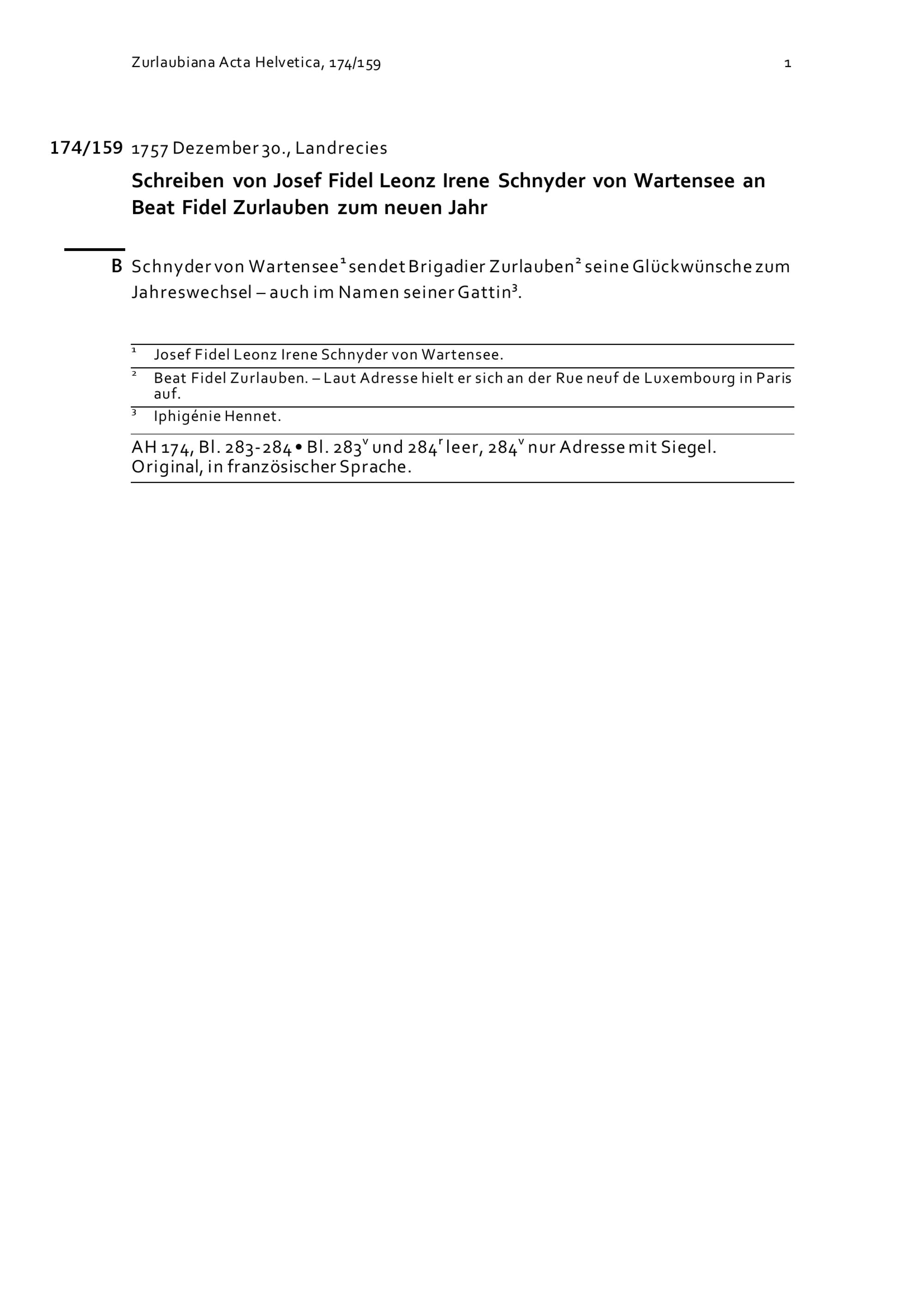 Schreiben von Josef Fidel Leonz Irene Schnyder von Wartensee an Beat Fidel Zurlauben...