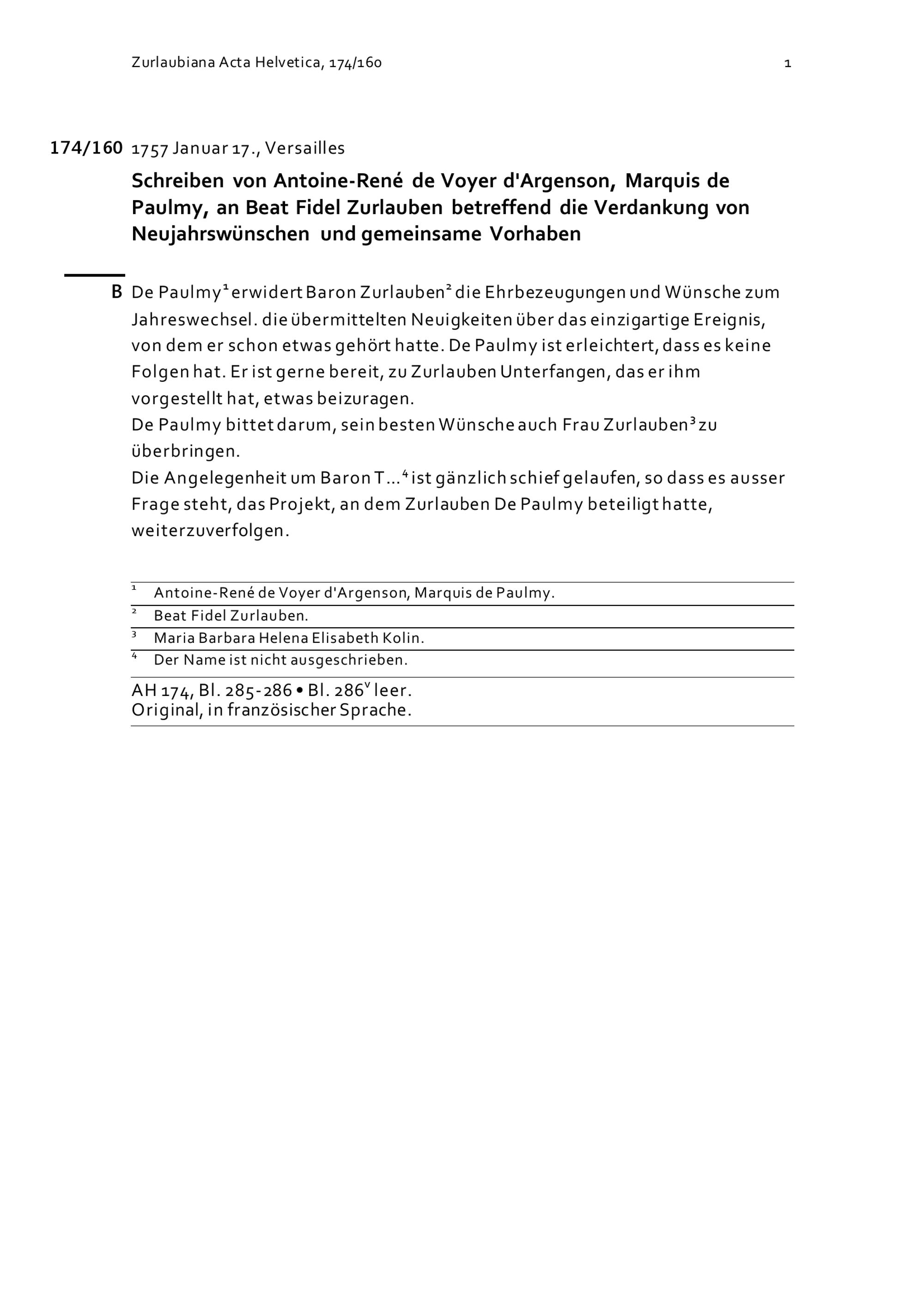 Schreiben von Antoine-René de Voyer d'Argenson, Marquis de Paulmy, an Beat Fidel Zurlauben betreffend die Verdankung von Neujahrswünschen und gemeinsame Vorhaben
