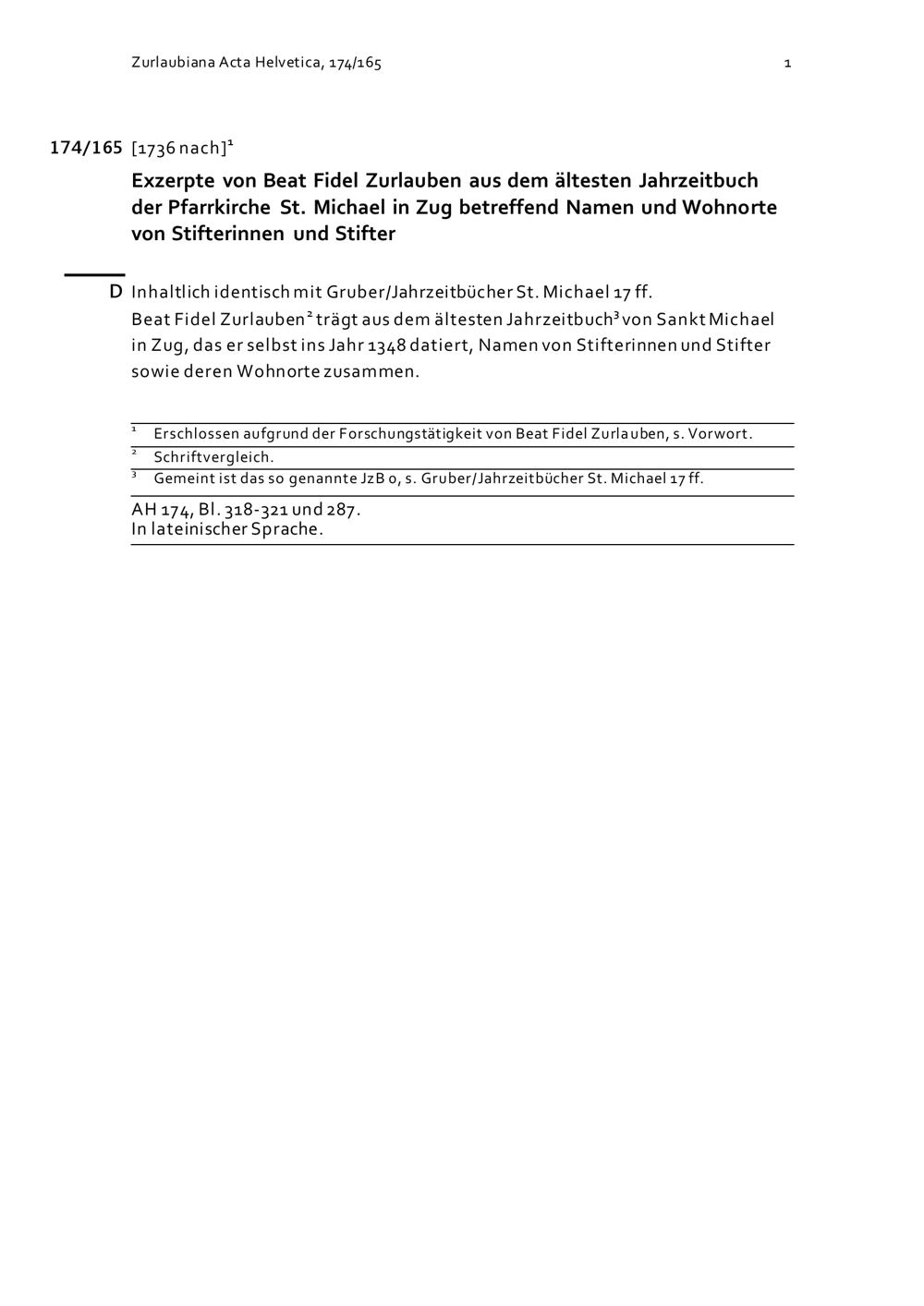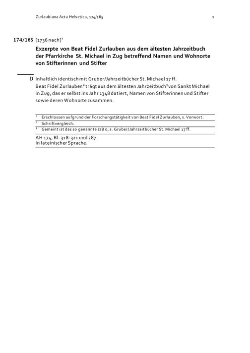 Exzerpte von Beat Fidel Zurlauben aus dem ältesten Jahrzeitenbuch der Pfarrkirche Sankt-Michael in Zug