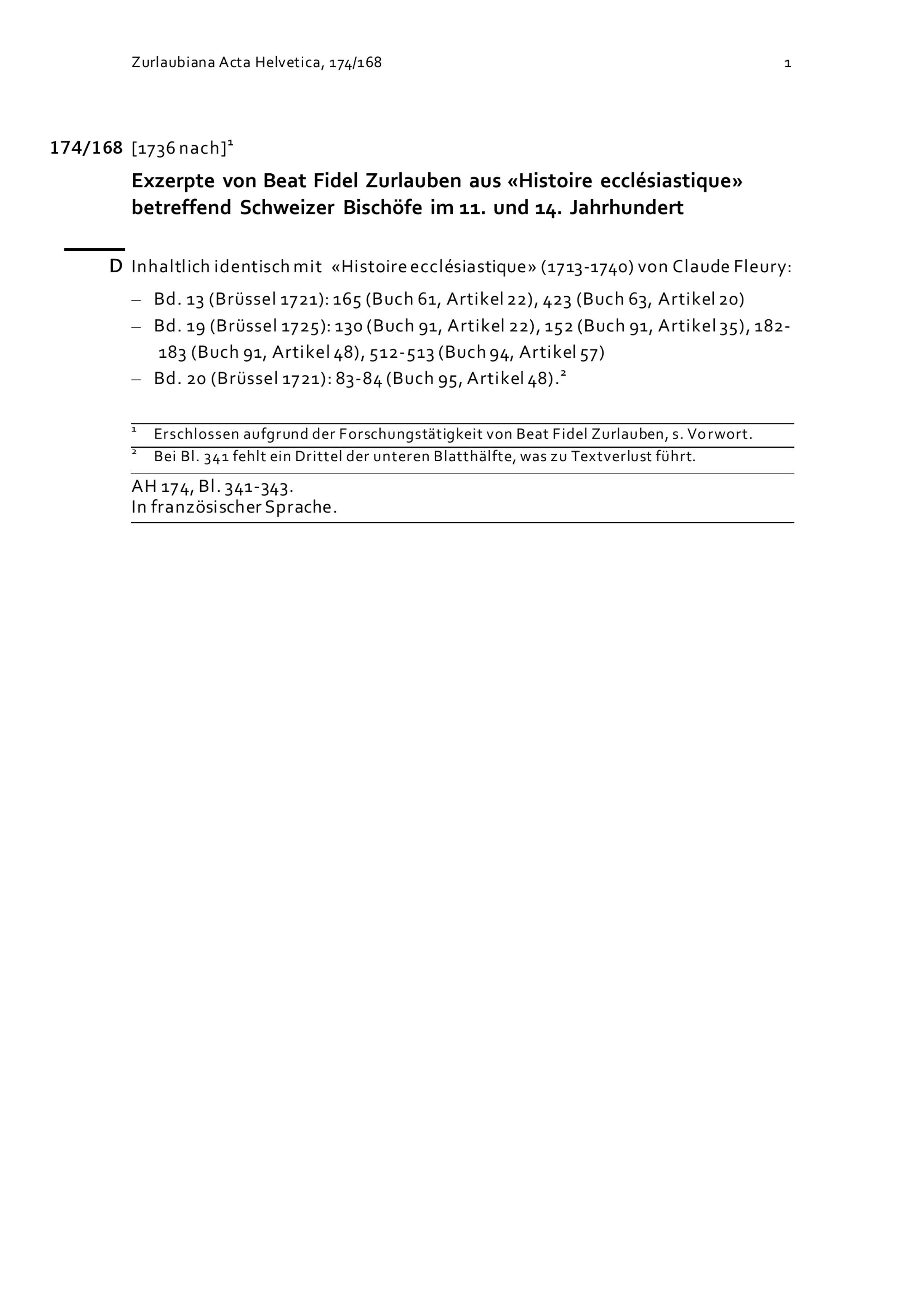 Exzerpte von Beat Fidel Zurlauben aus «Histoire ecclésiastique» betreffend Schweizer...