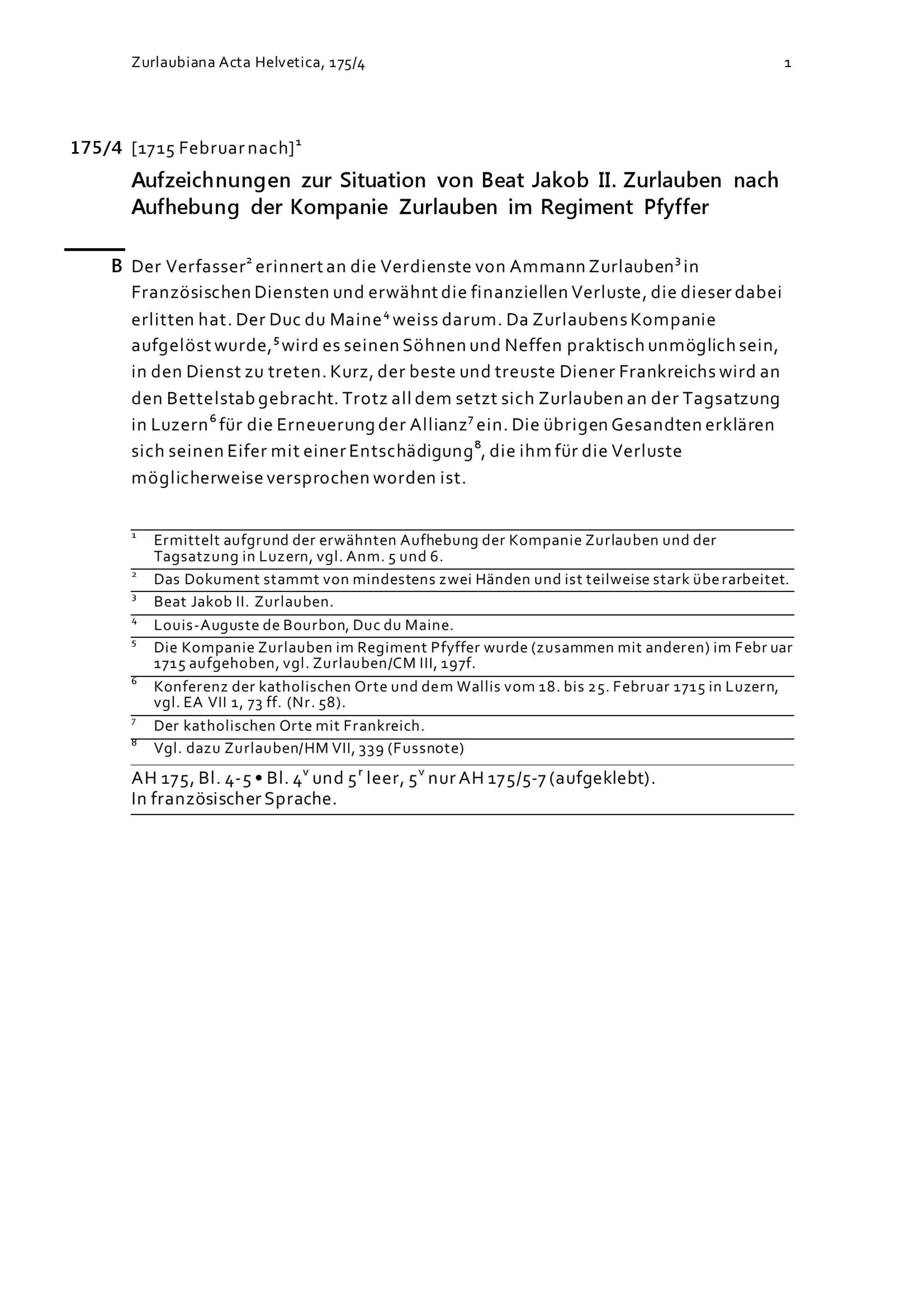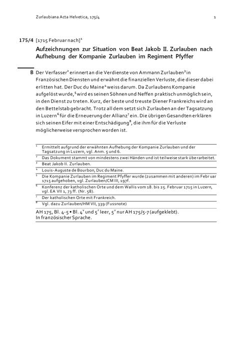 Aufzeichnungen zur Situation von Beat Jakob II. Zurlauben nach Aufhebung der Kompanie Zurlauben im Regiment Pfyffer