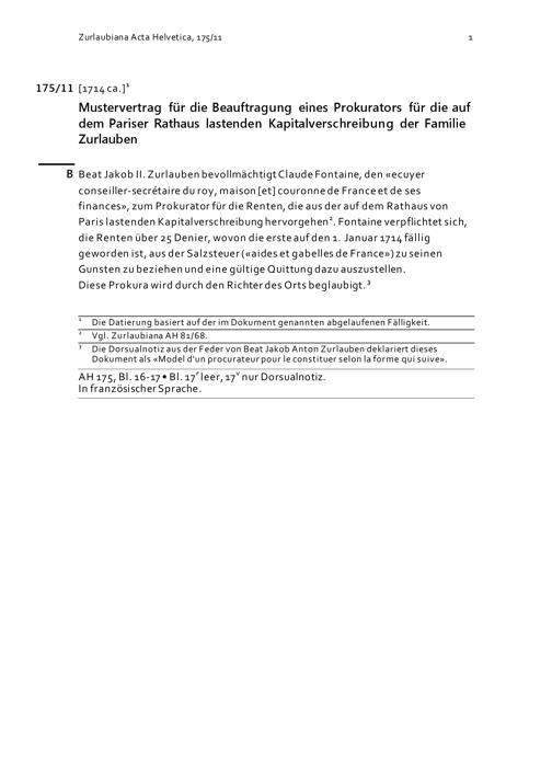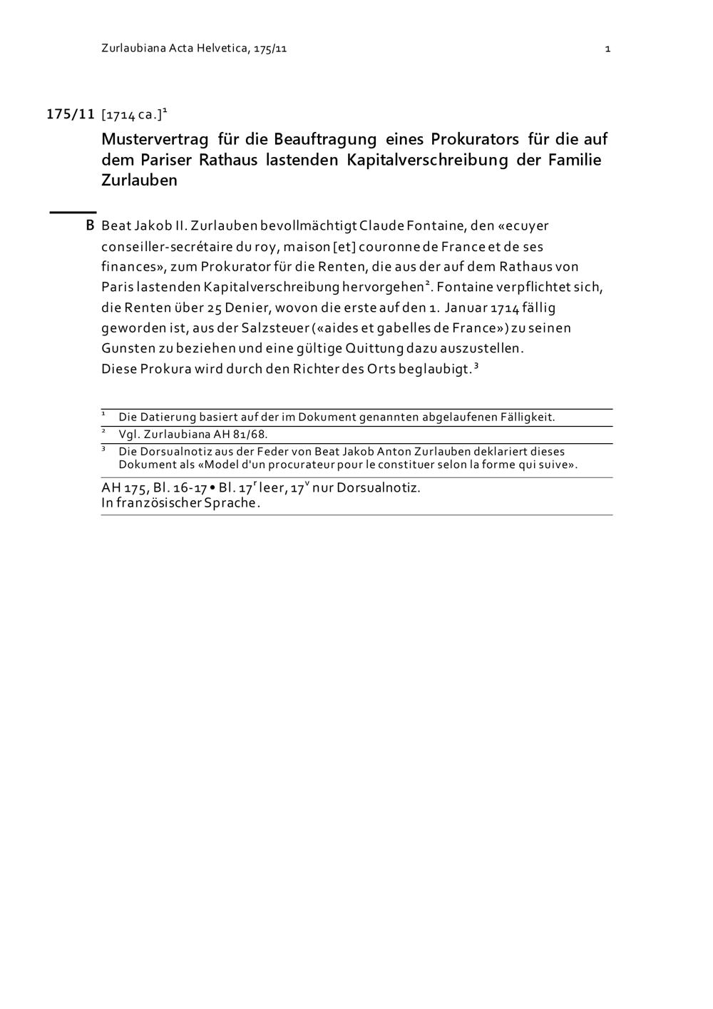 Mustervertrag für die Beauftragung eines Prokurators für die auf dem Pariser Rathaus lastenden Kapitalverschreibung der Familie Zurlauben