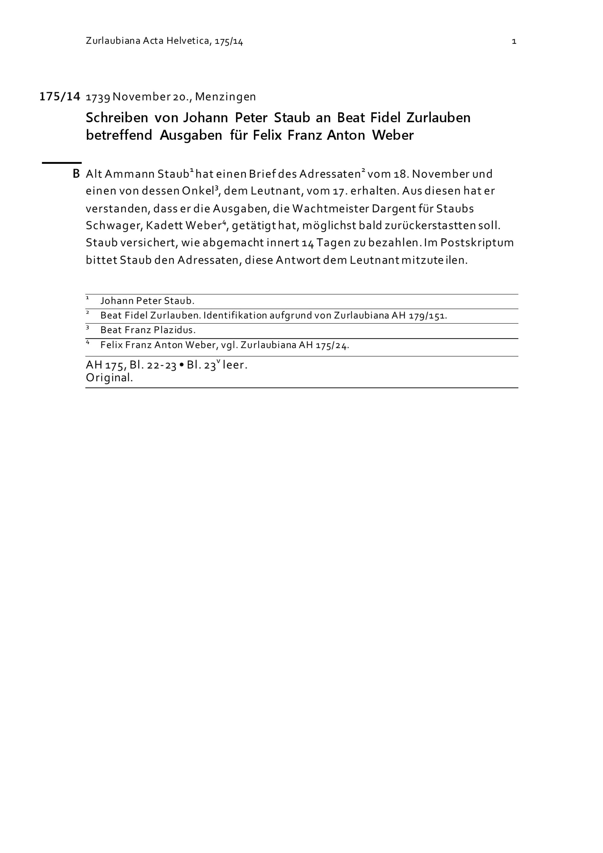 Schreiben von Johann Peter Staub an Beat Fidel Zurlauben betreffend Ausgaben für Felix Franz Anton Weber