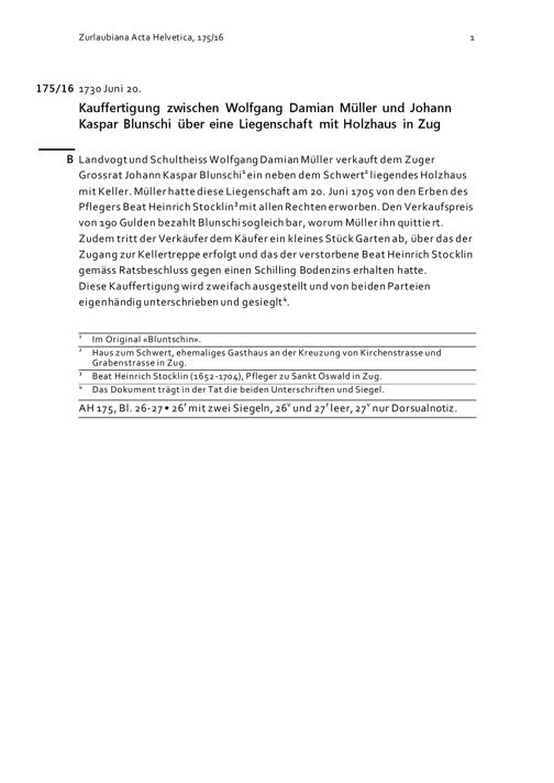 Kauffertigung zwischen Wolfgang Damian Müller und Johann Kaspar Blunschi über eine Liegenschaft mit Holzhaus in Zug