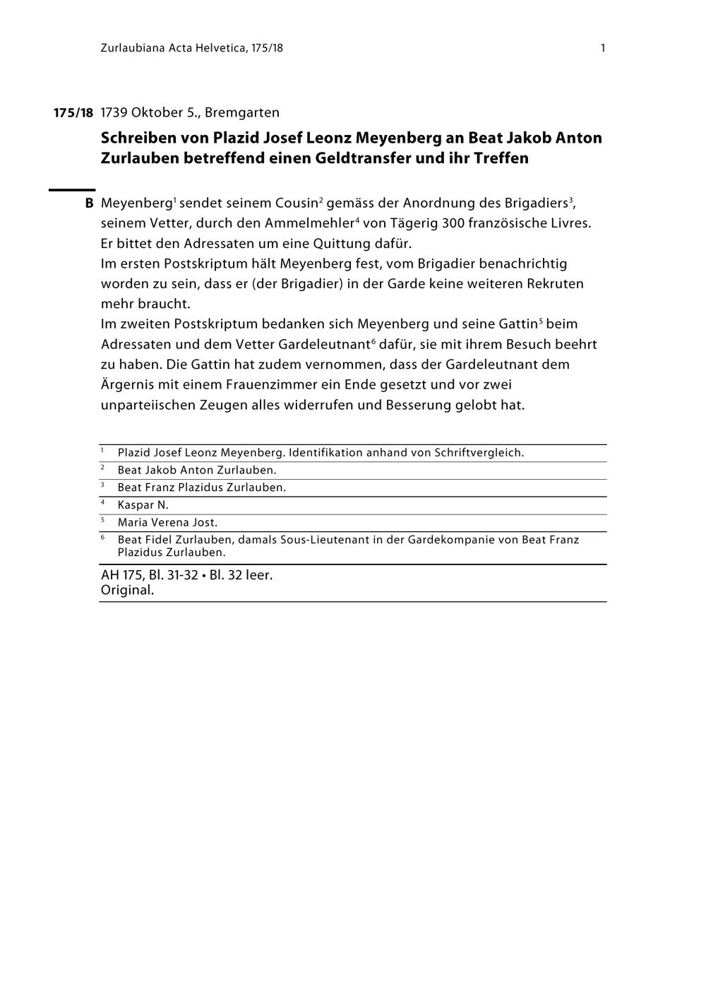 Schreiben von Plazid Josef Leonz Meyenberg an Beat Jakob Anton Zurlauben betreffend...