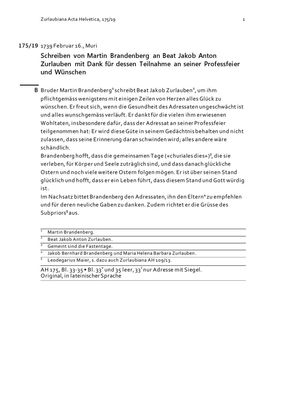 Schreiben von Martin Brandenberg an Beat Jakob Anton Zurlauben mit Dank für dessen Teilnahme an seiner Professfeier und Wünschen