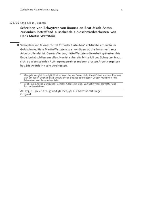Schreiben von einem Schwytzer, von Buonas, an Beat Jakob Anton Zurlauben betreffend die an den Goldschmied Hans Martin Wettstein übergebene Arbeit