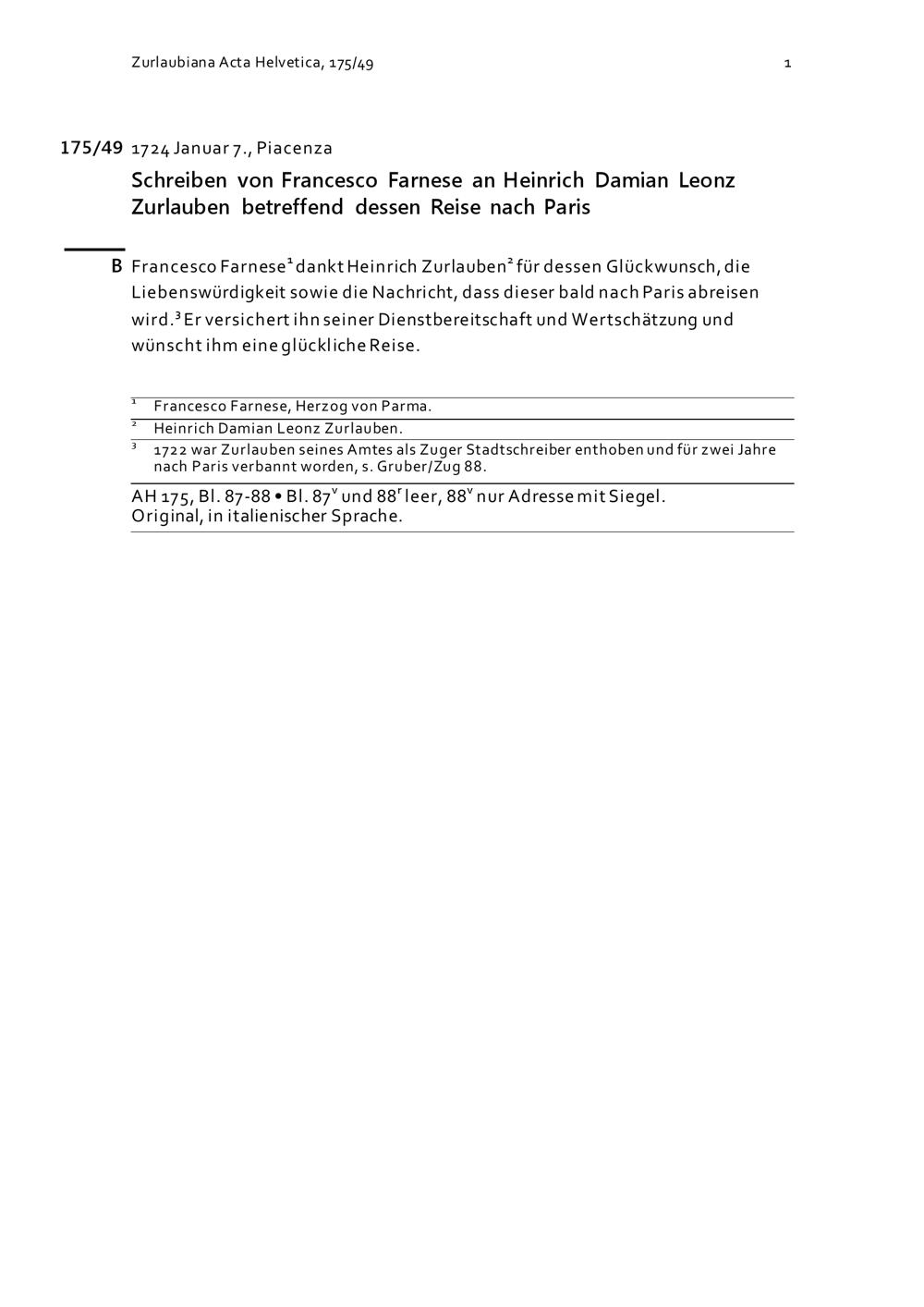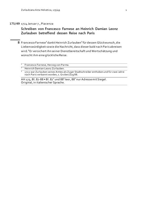 Schreiben von Francesco Farnese an Heinrich Damian Leonz Zurlauben betreffend dessen Reise nach Paris