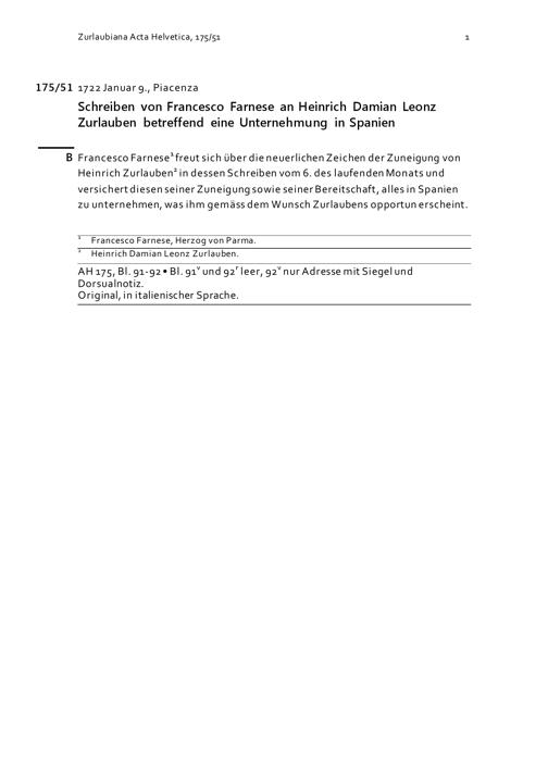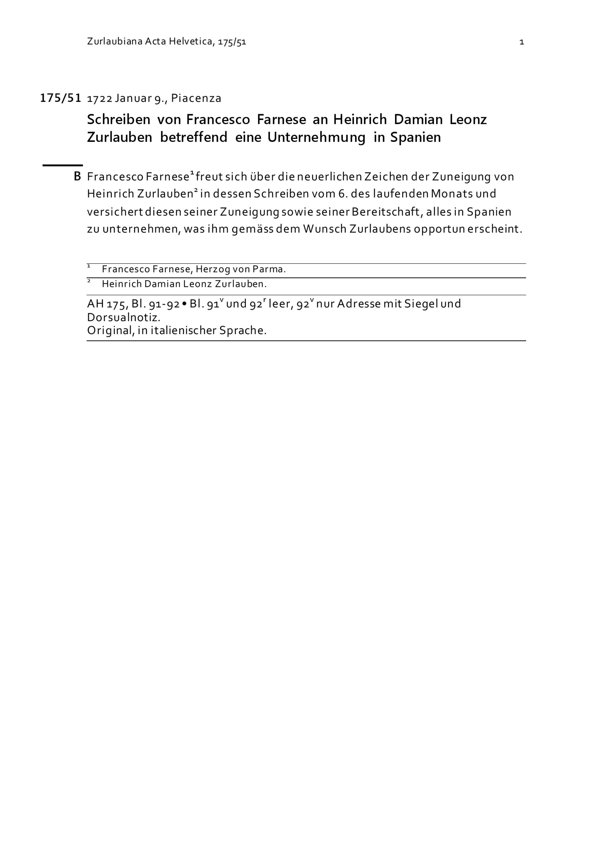 Schreiben von Francesco Farnese an Heinrich Damian Leonz Zurlauben betreffend eine...