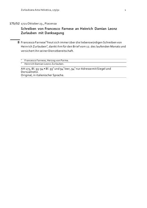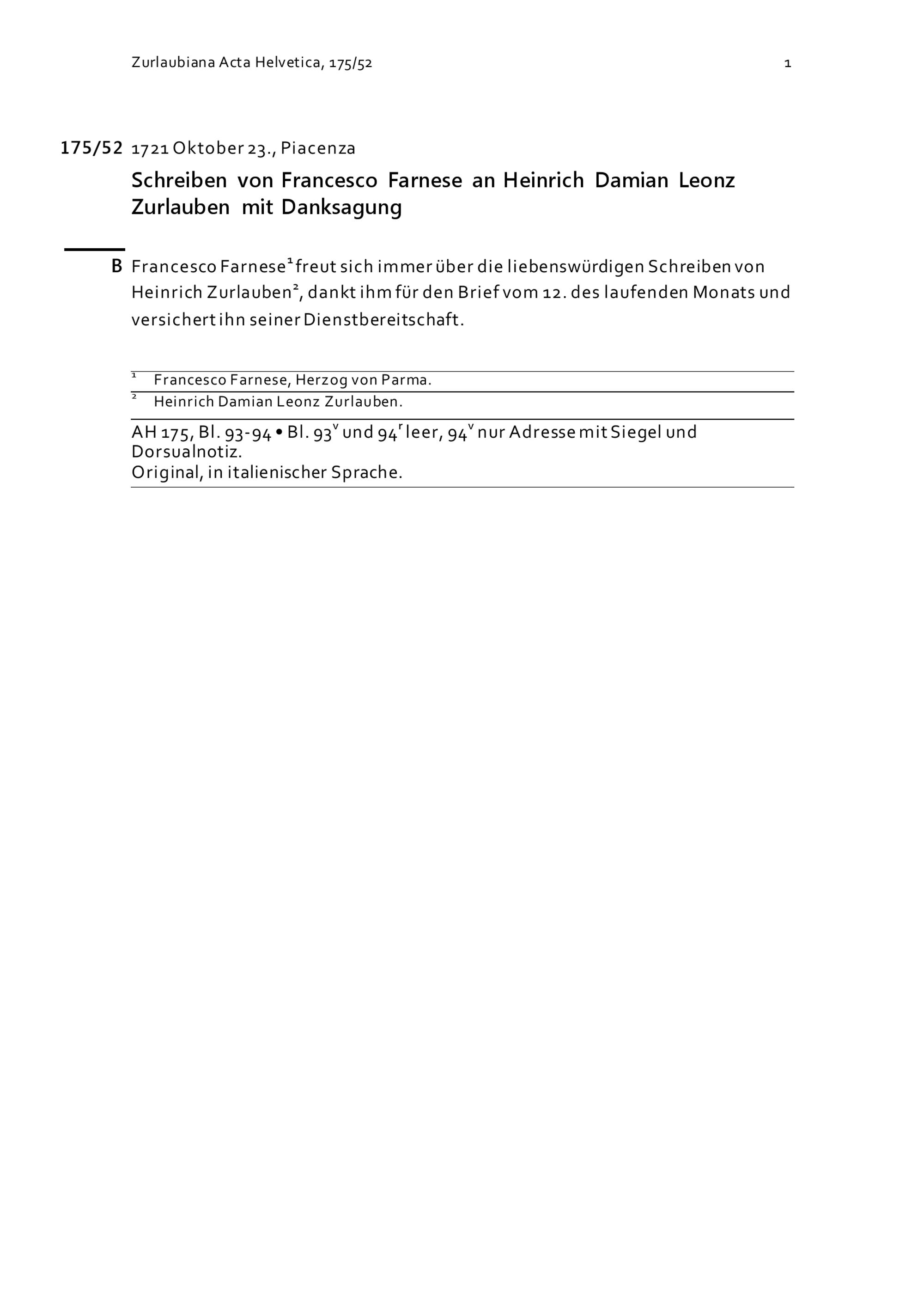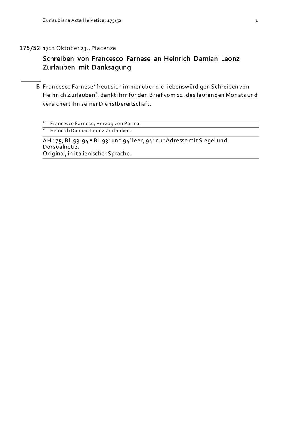 Schreiben von Francesco Farnese an Heinrich Damian Leonz Zurlauben mit Danksagung